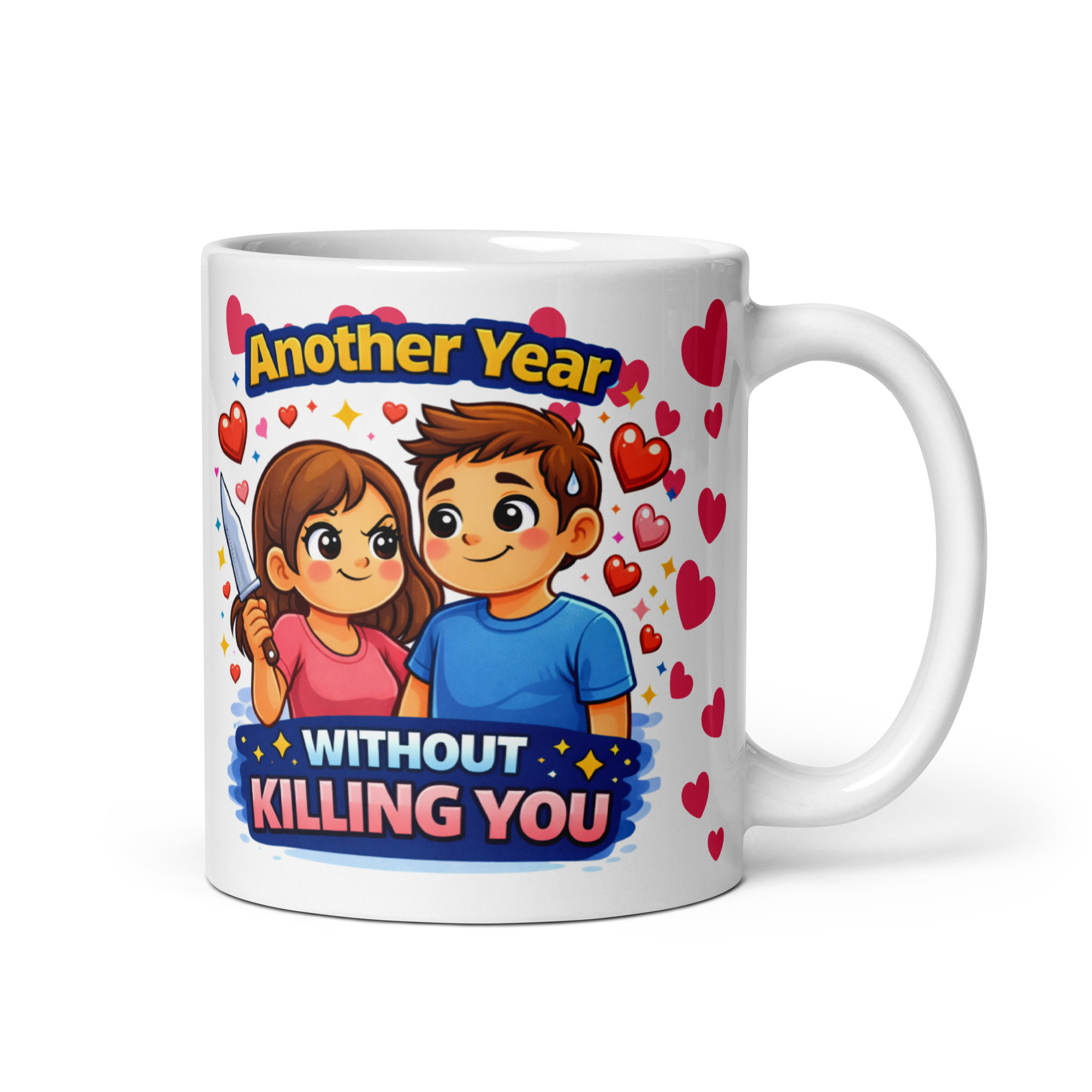 The design says it all. A cute cartoon couple sits surrounded by hearts and sparkles, but the twist is brilliantly wicked: the woman is holding a knife while the lad looks (slightly nervy) beside her. Above, it reads “Another Year”, and underneath comes the punchline in big, confident lettering: “WITHOUT KILLING YOU”. It’s the sort of humour that couples with thick skin and big affection absolutely love – because it’s clearly a joke, and it’s clearly you two.