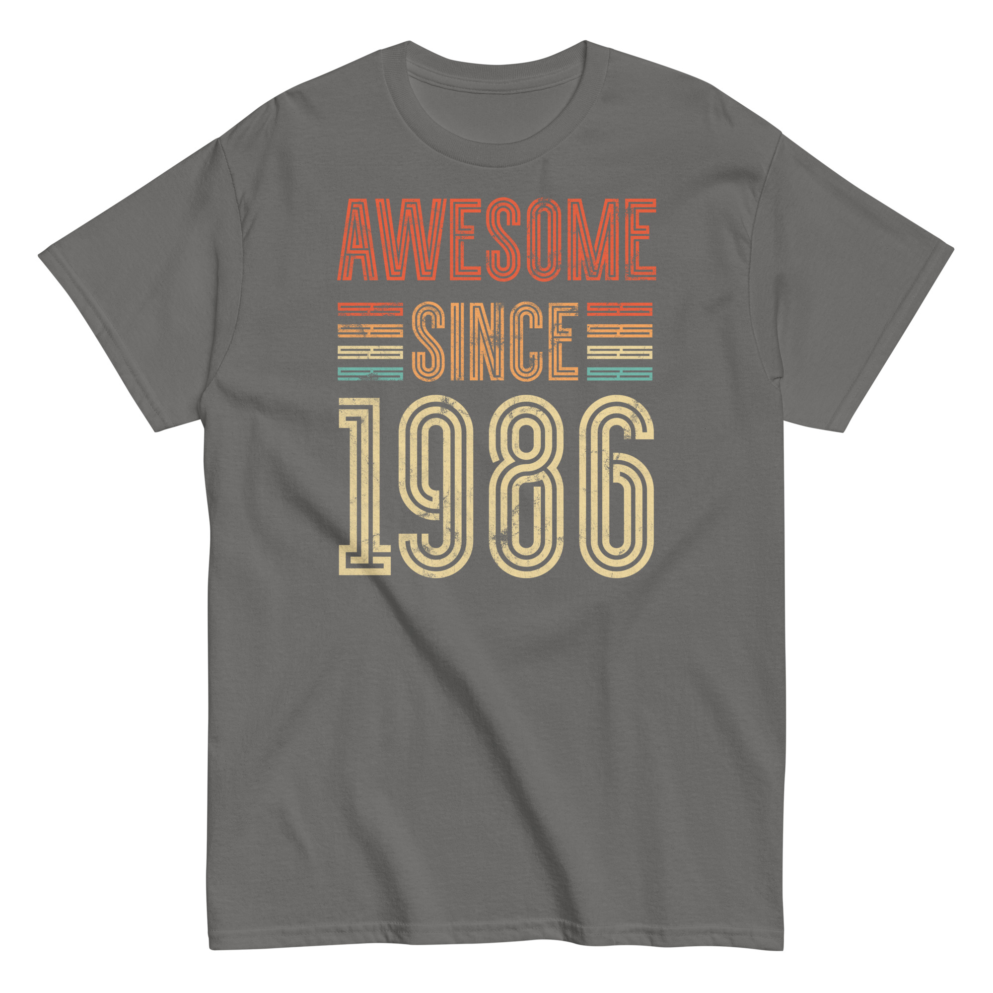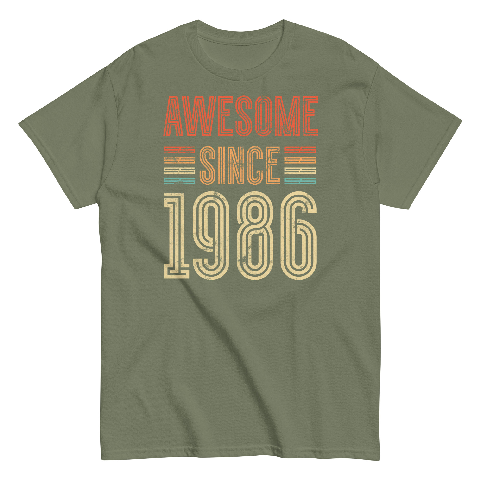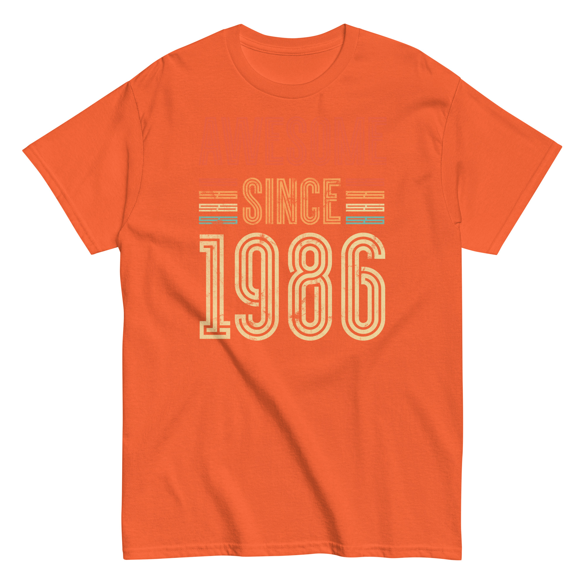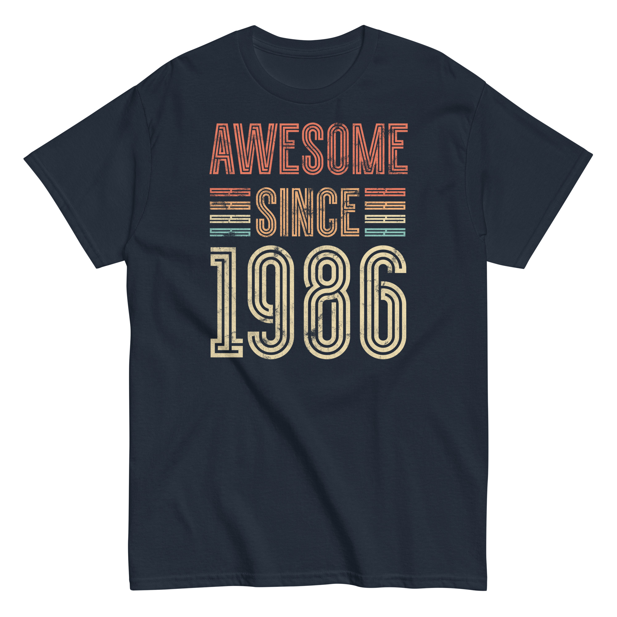 This isn’t just a T-shirt – it’s a statement. The distressed typography gives off a classic retro vibe, while the striped highlights in burnt orange, mustard and teal add just enough pop without going overboard. The phrase “Awesome Since 1986” is front and centre, and it speaks for itself – perfect for the man who’s always been confident in his own skin.