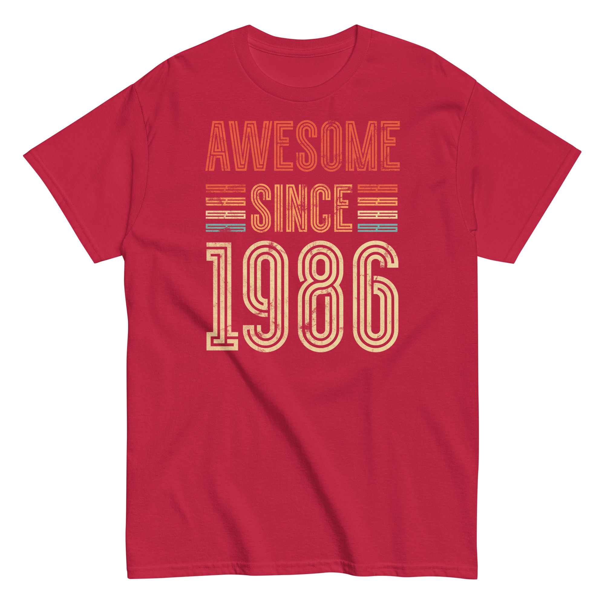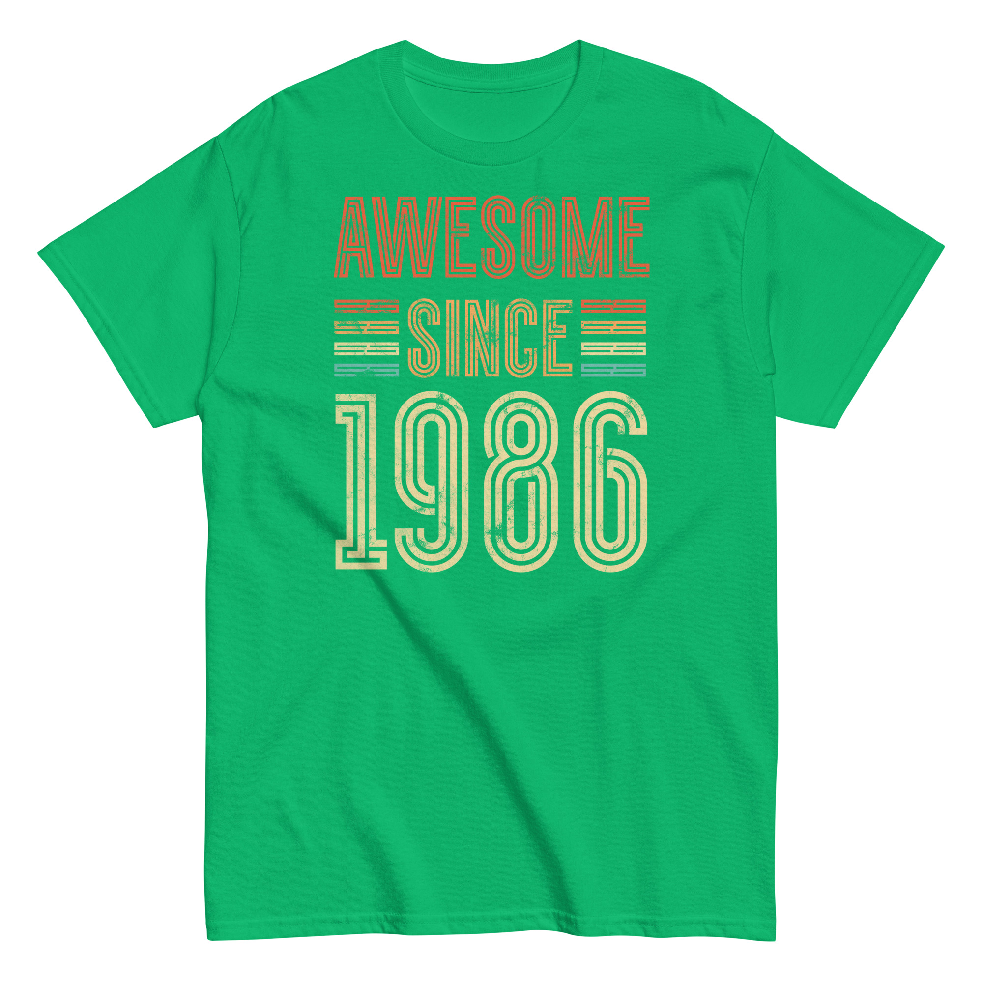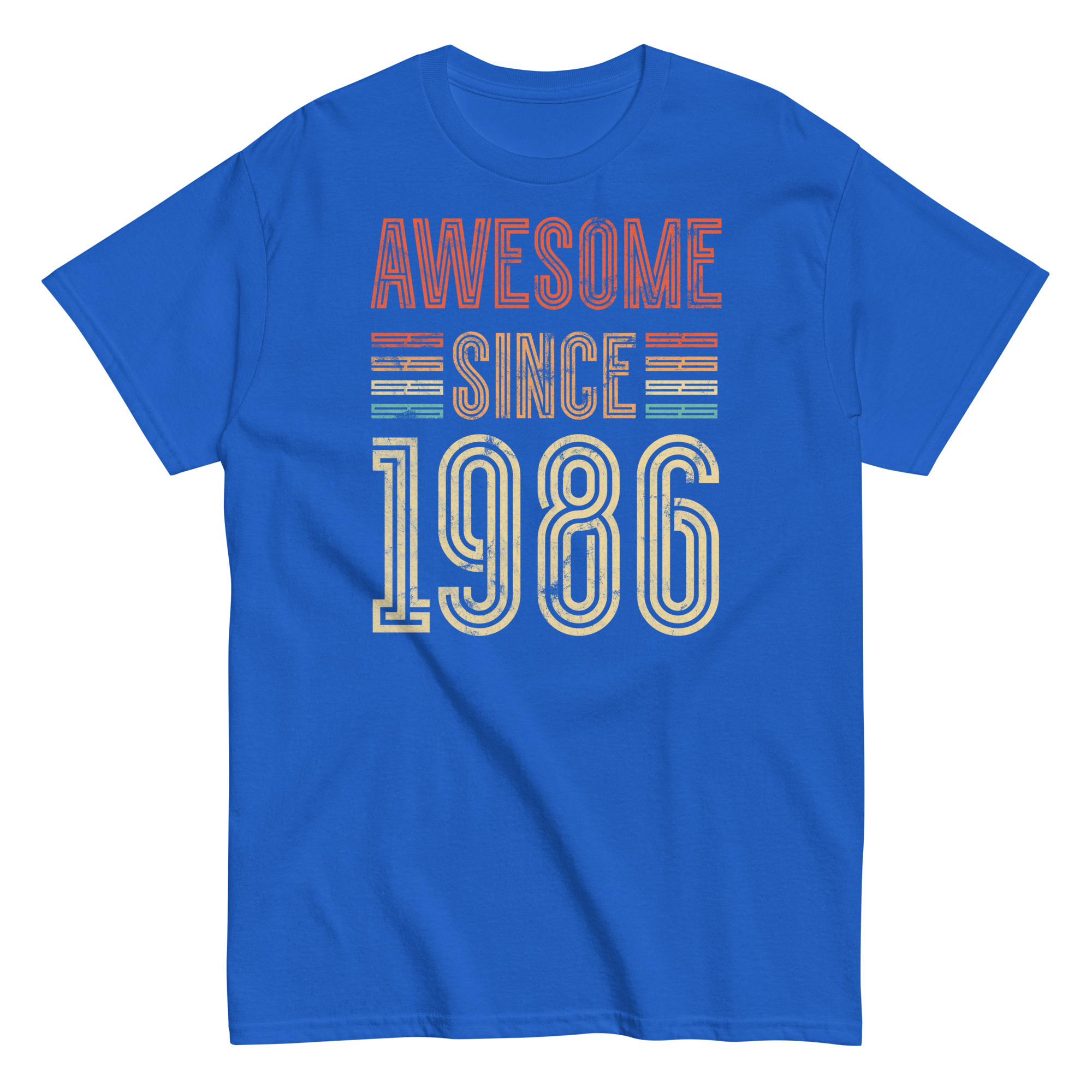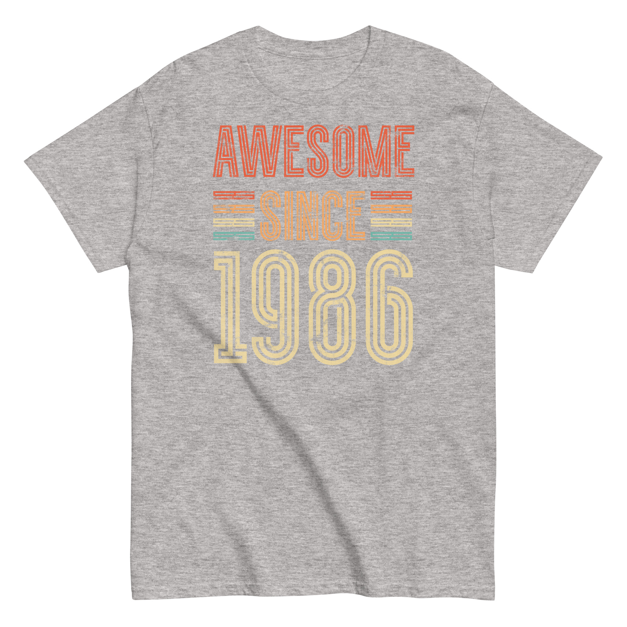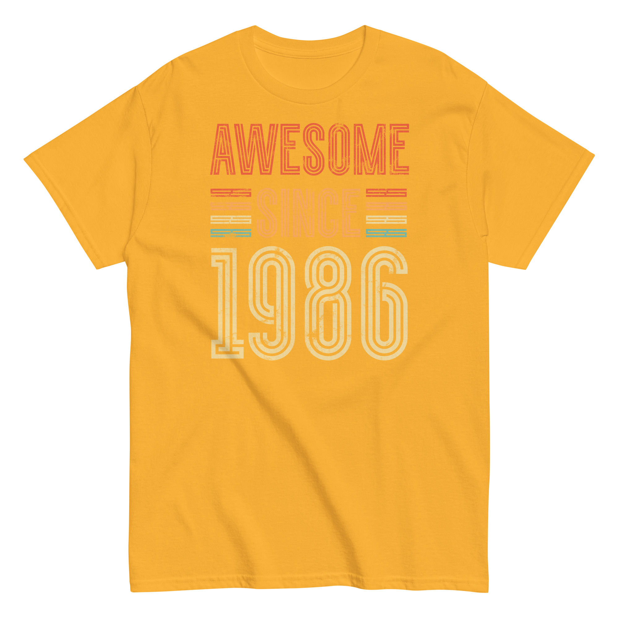 This isn’t just a T-shirt – it’s a statement. The distressed typography gives off a classic retro vibe, while the striped highlights in burnt orange, mustard and teal add just enough pop without going overboard. The phrase “Awesome Since 1986” is front and centre, and it speaks for itself – perfect for the man who’s always been confident in his own skin.