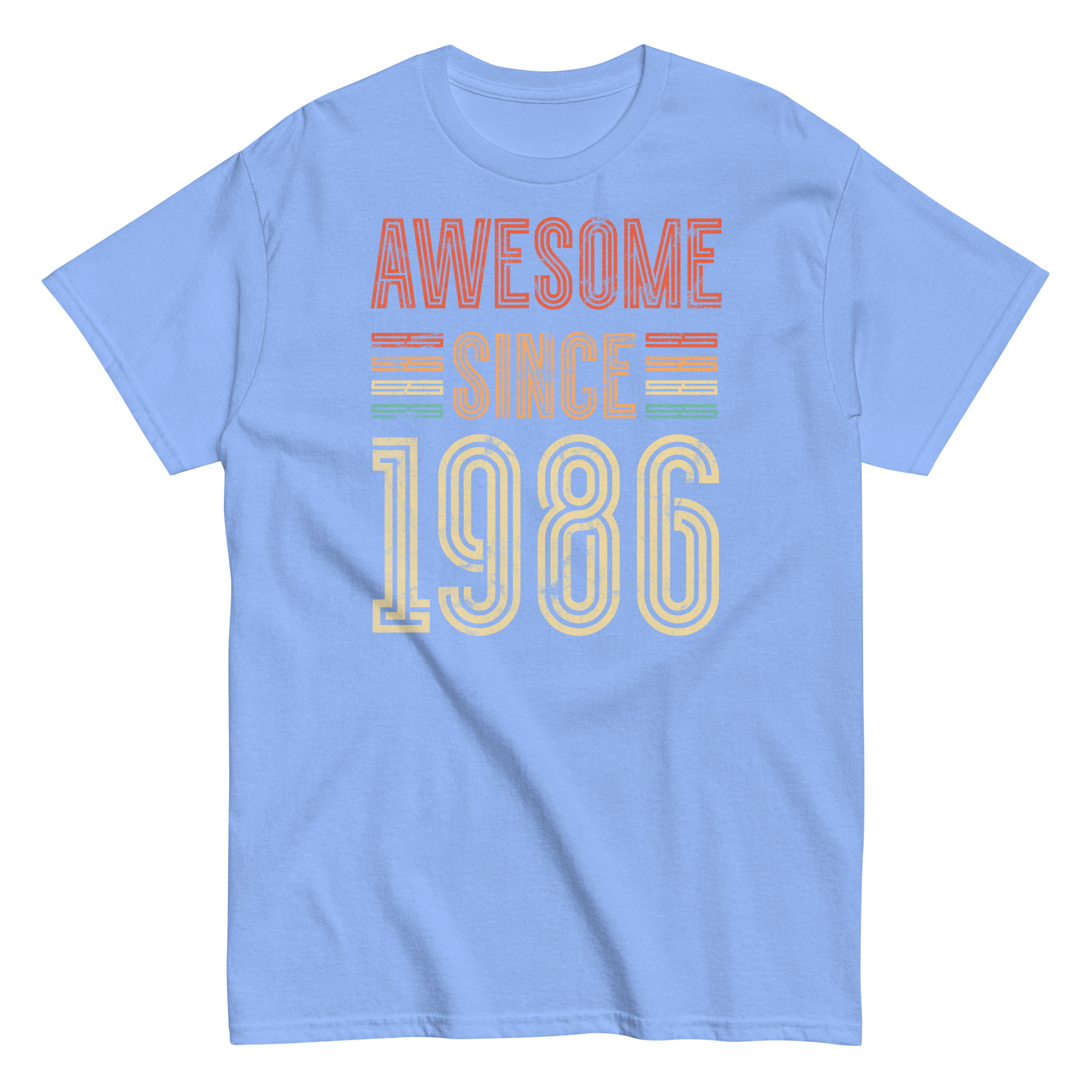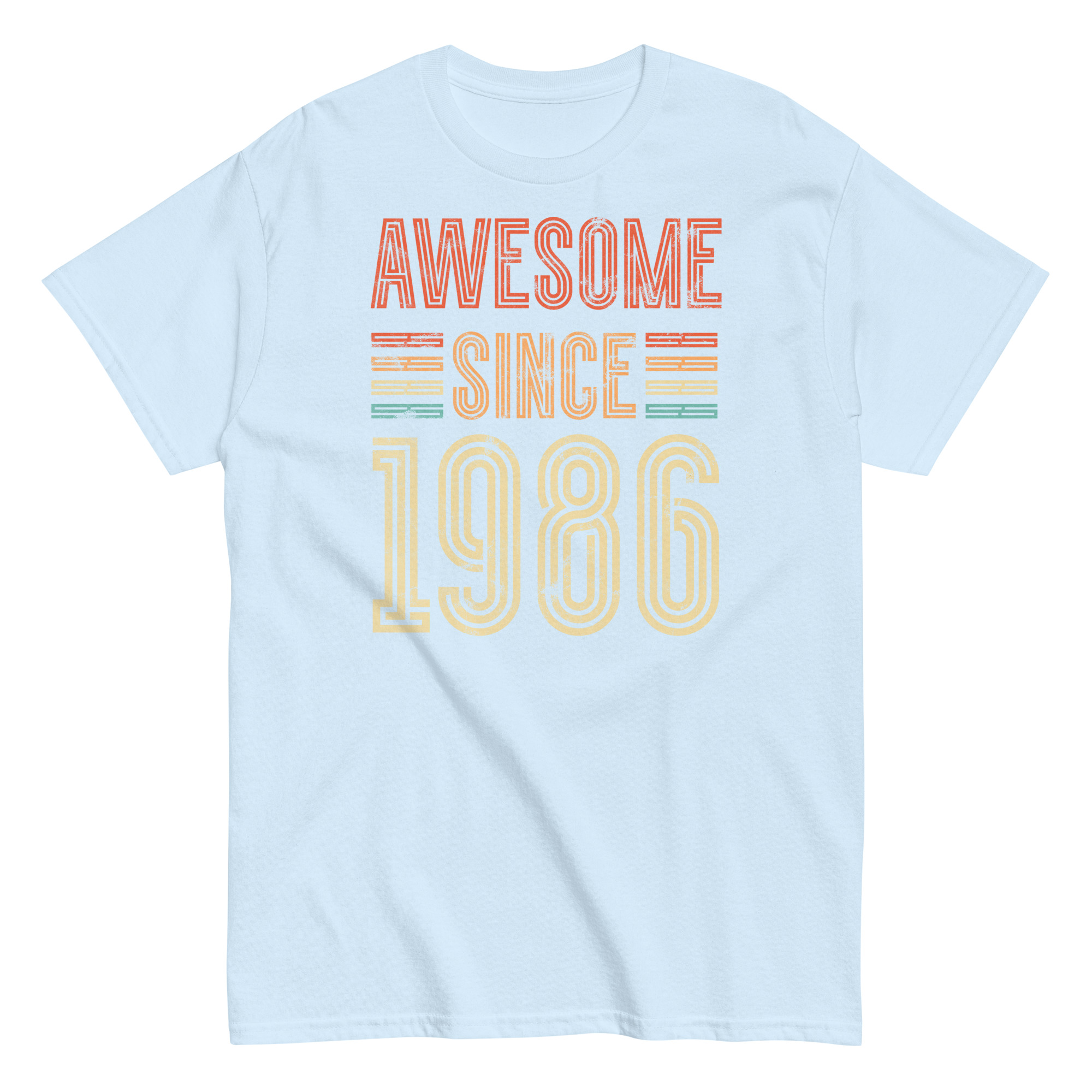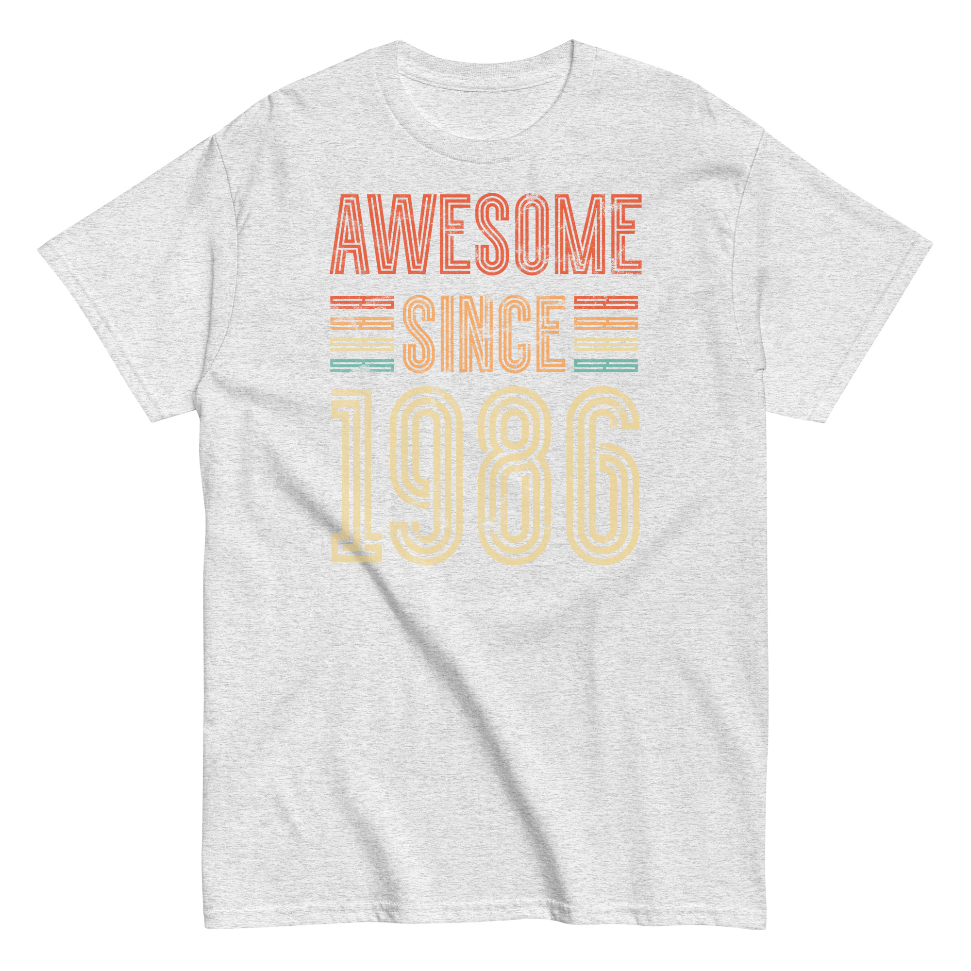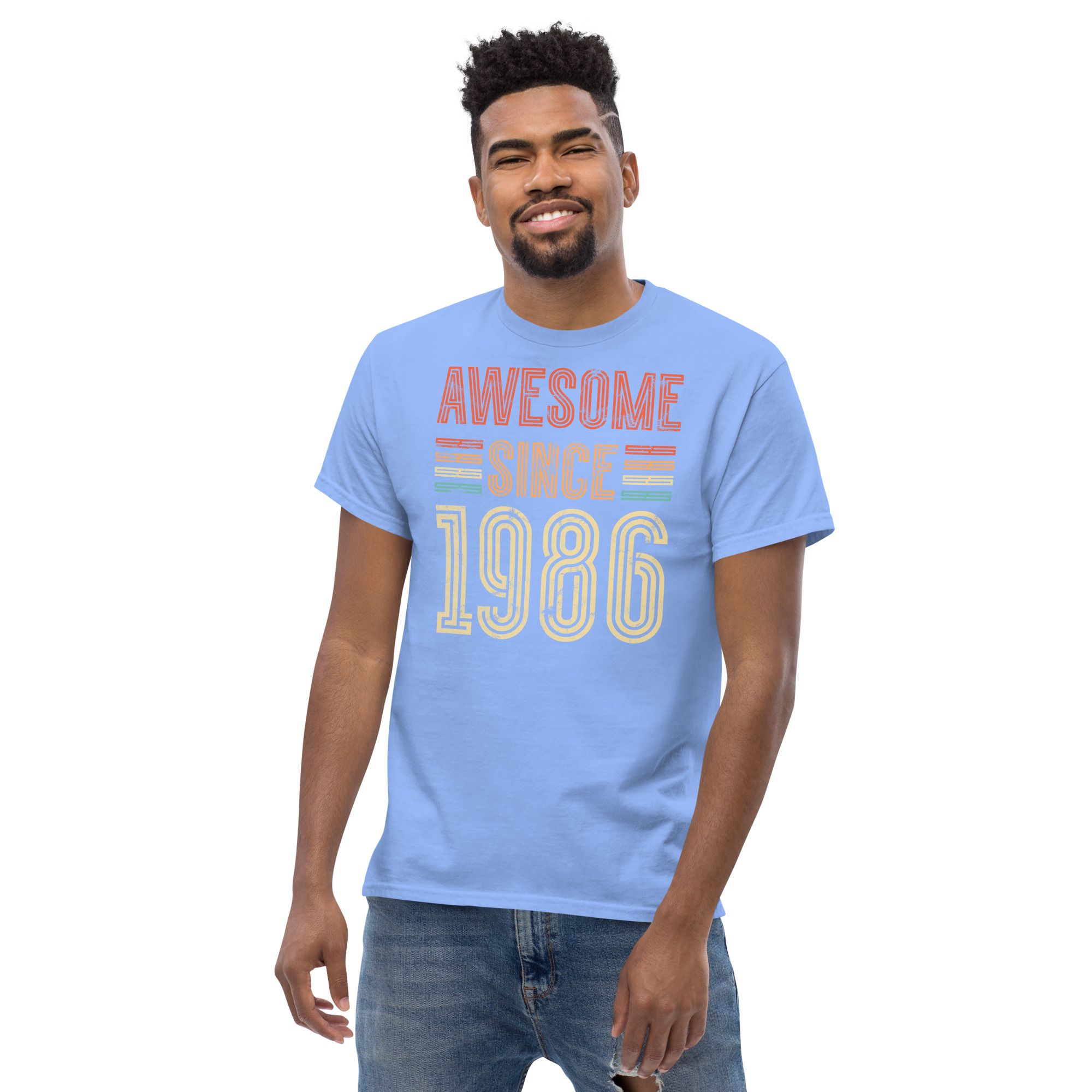 This isn’t just a T-shirt – it’s a statement. The distressed typography gives off a classic retro vibe, while the striped highlights in burnt orange, mustard and teal add just enough pop without going overboard. The phrase “Awesome Since 1986” is front and centre, and it speaks for itself – perfect for the man who’s always been confident in his own skin.
