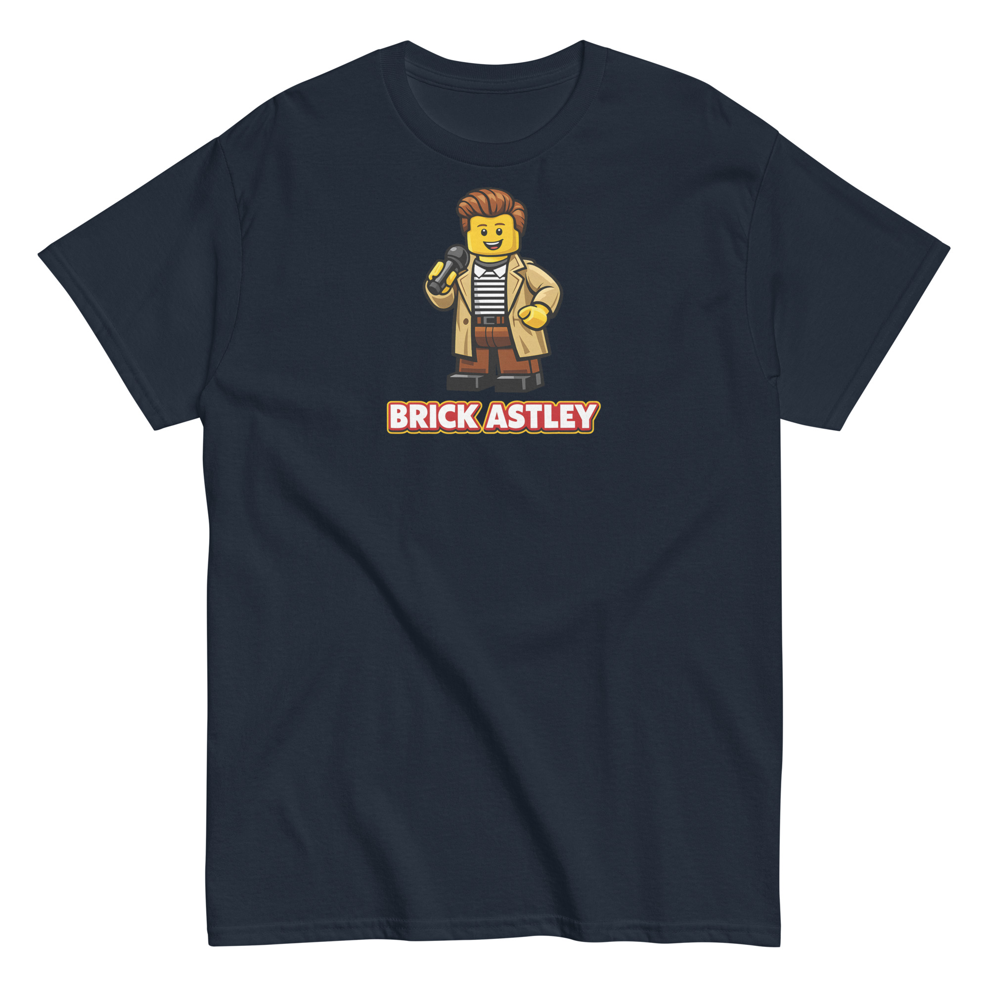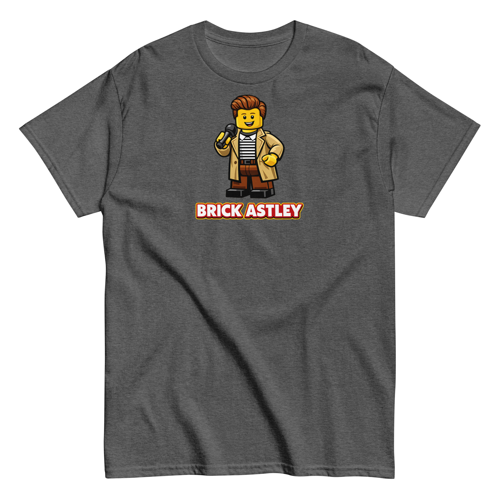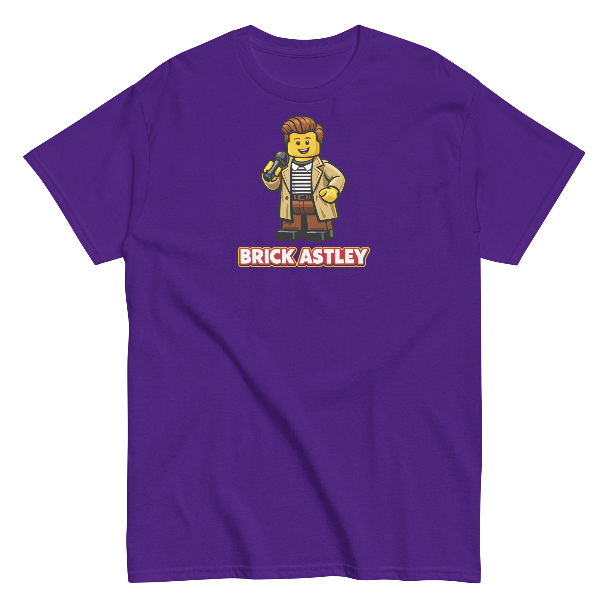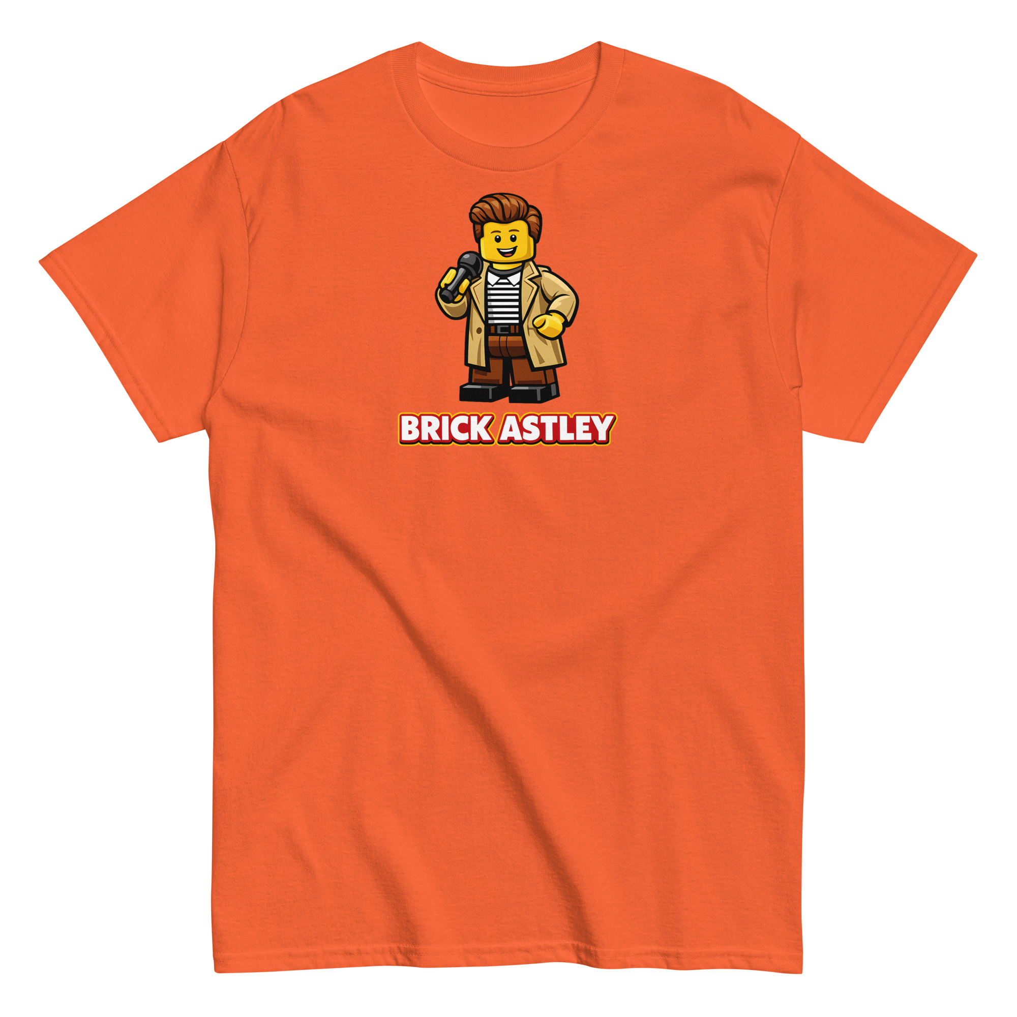 Looking for the perfect gift that combines a love for nostalgia with a dash of humour? Look no further than the Brick Astley T-shirt! This fun and quirky tee features a yellow character that bears a striking resemblance to the iconic 1980s pop sensation, Rick Astley. With his signature quiff hairstyle and a wardrobe inspired by the unforgettable “Never Gonna Give You Up” music video, this t-shirt brings a playful twist to the world of retro fashion.