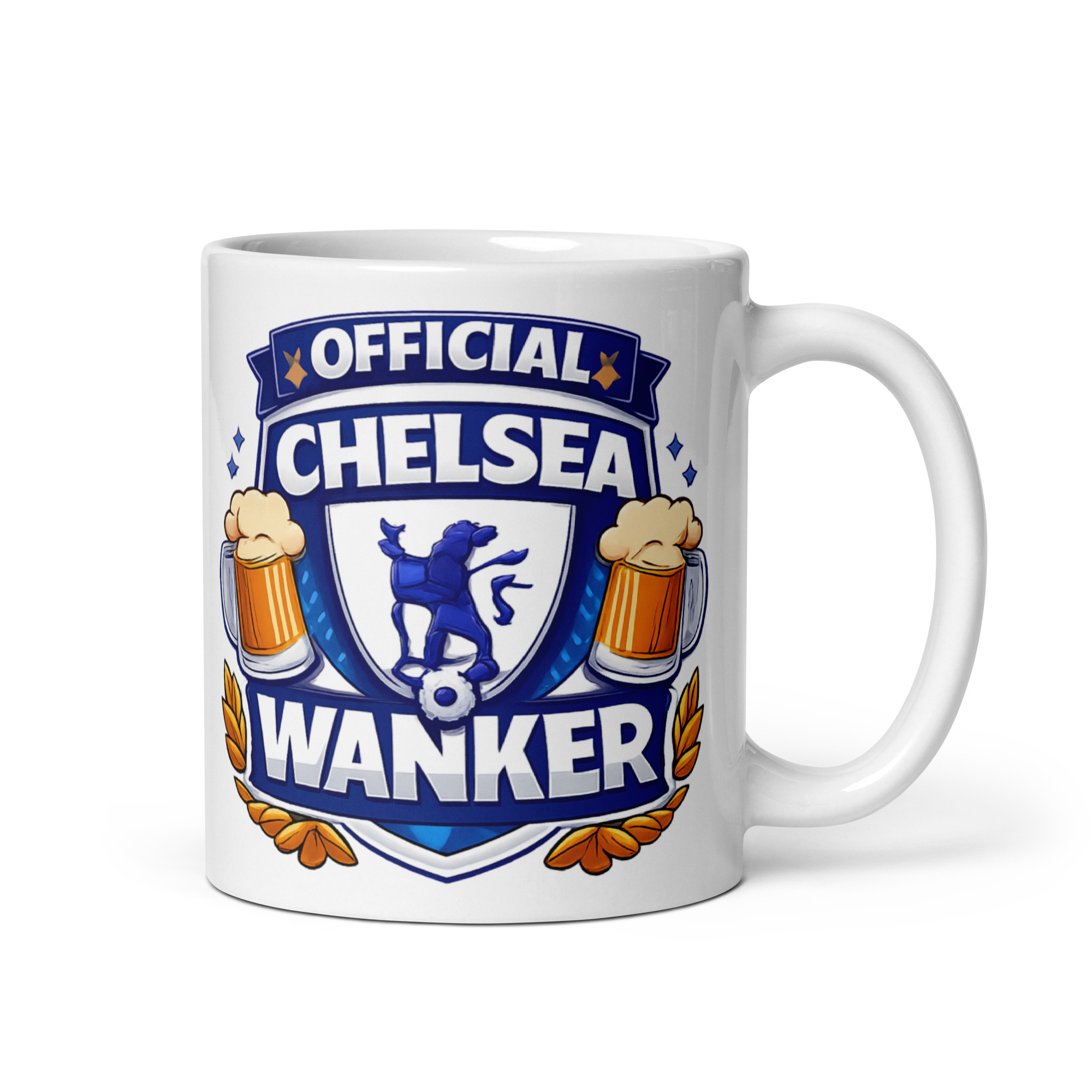 Let’s face it—Chelsea fans give it large, so this mug gives it right back. Styled like a mock club crest, the design features a roaring blue lion, a football, a pair of frothy beer mugs, and golden laurel leaves—all wrapped up in those unmistakable royal blue tones. Topped off with the bold label Official Chelsea Wanker, it’s the perfect gag gift for lads who don’t mind being the butt of the joke.