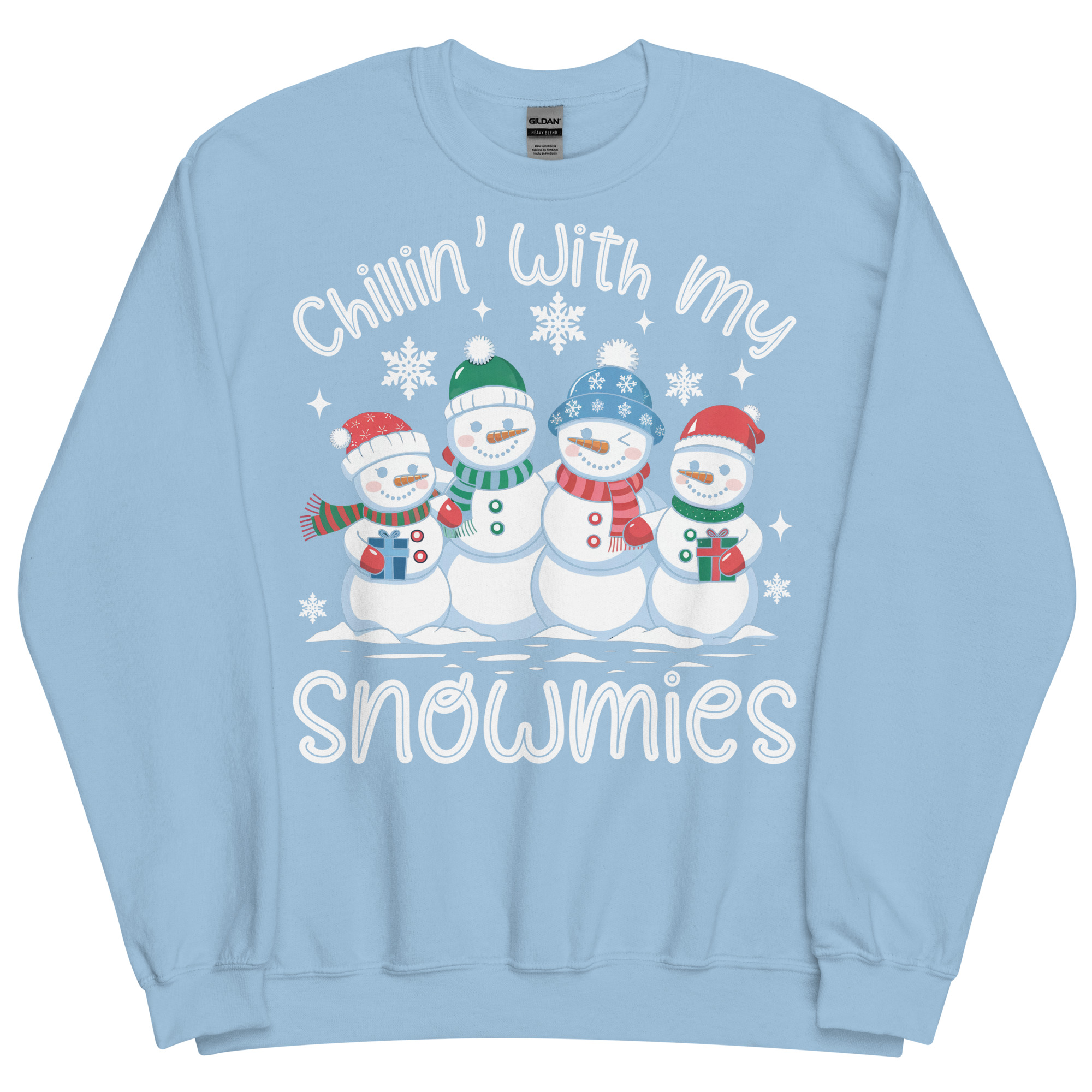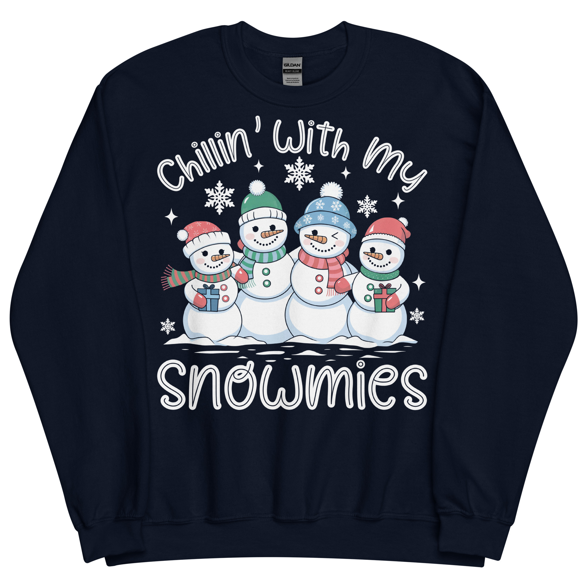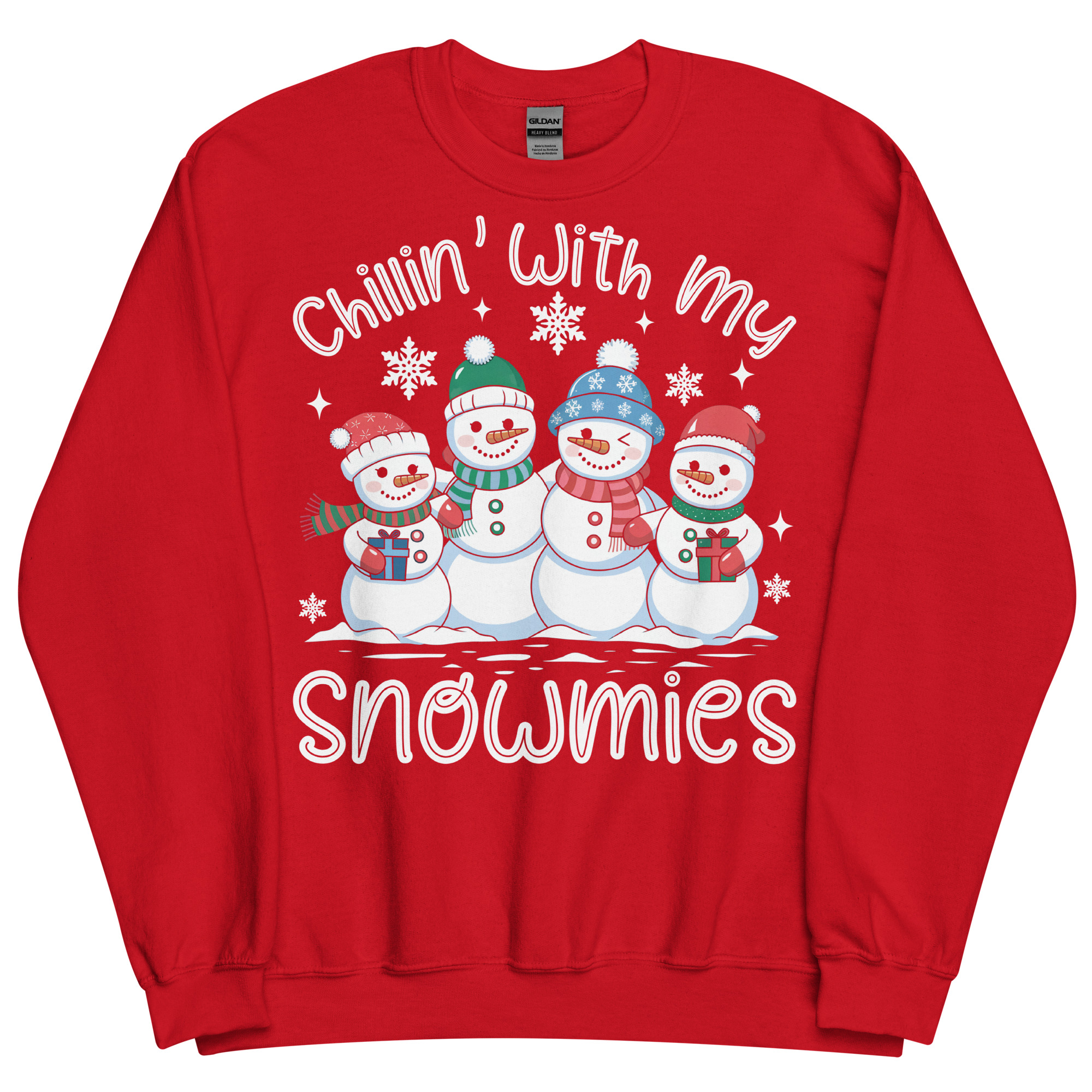 This jumper features four adorable snowmen lined up like they’re posing for the most wholesome squad photo of the season. Each one has a different hat, scarf and smile, giving them bags of personality. They’re dotted with sparkly little snowflakes, and beneath them sits the phrase “Chillin’ With My Snowmies” in a big friendly white script. The bright red backdrop makes everything pop beautifully, giving the whole piece a cosy, cheerful, wintery vibe perfect for December antics.