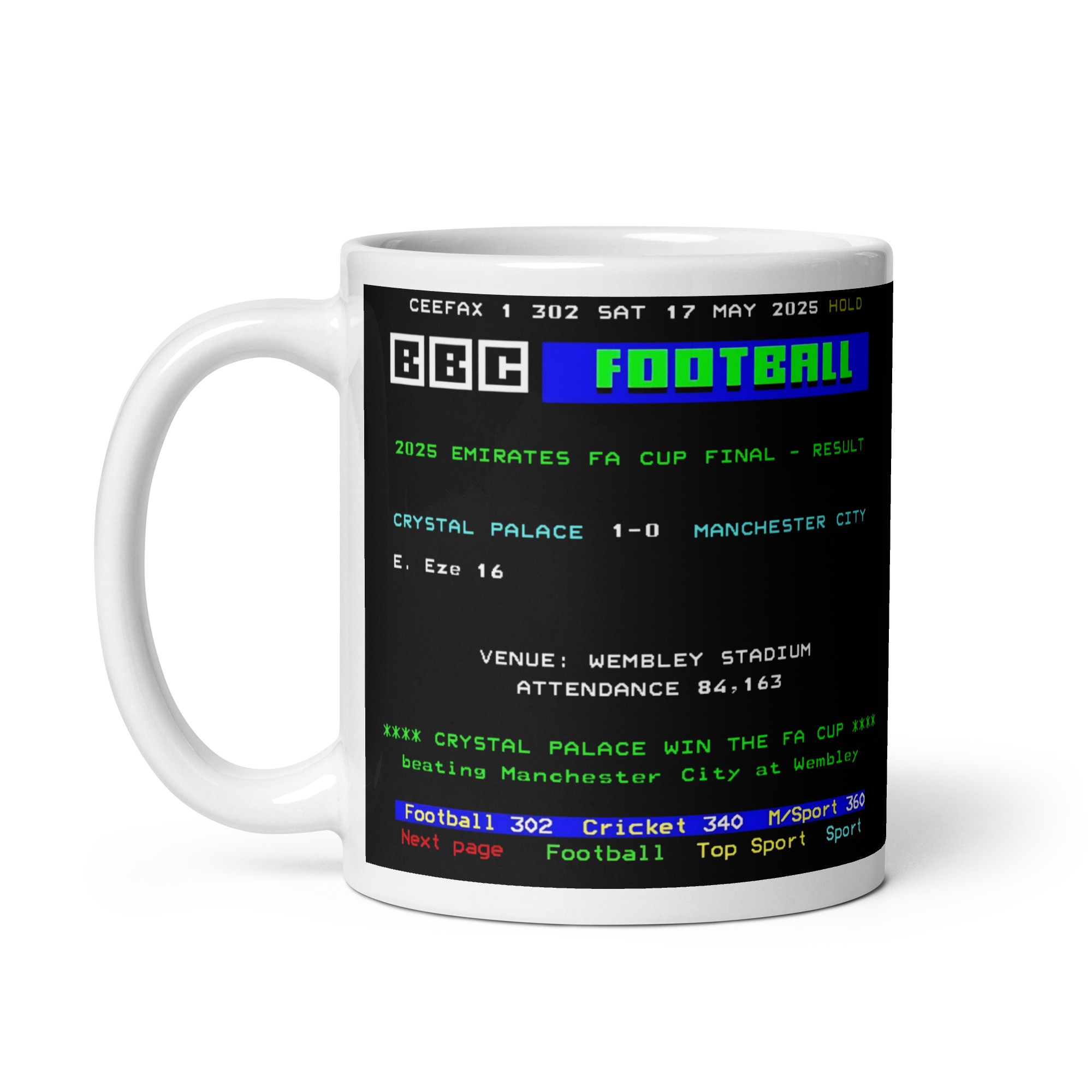 BBC Ceefax, the world’s first teletext information service, was a British institution. Running from 1974 to 2012, it became synonymous with breaking news, live football scores, and those pixelated graphics we all grew to love. The mug features a beautifully detailed Ceefax-style screen showing the full-time result, match date, stadium location, and Eze’s name highlighted for his match-winning goal.