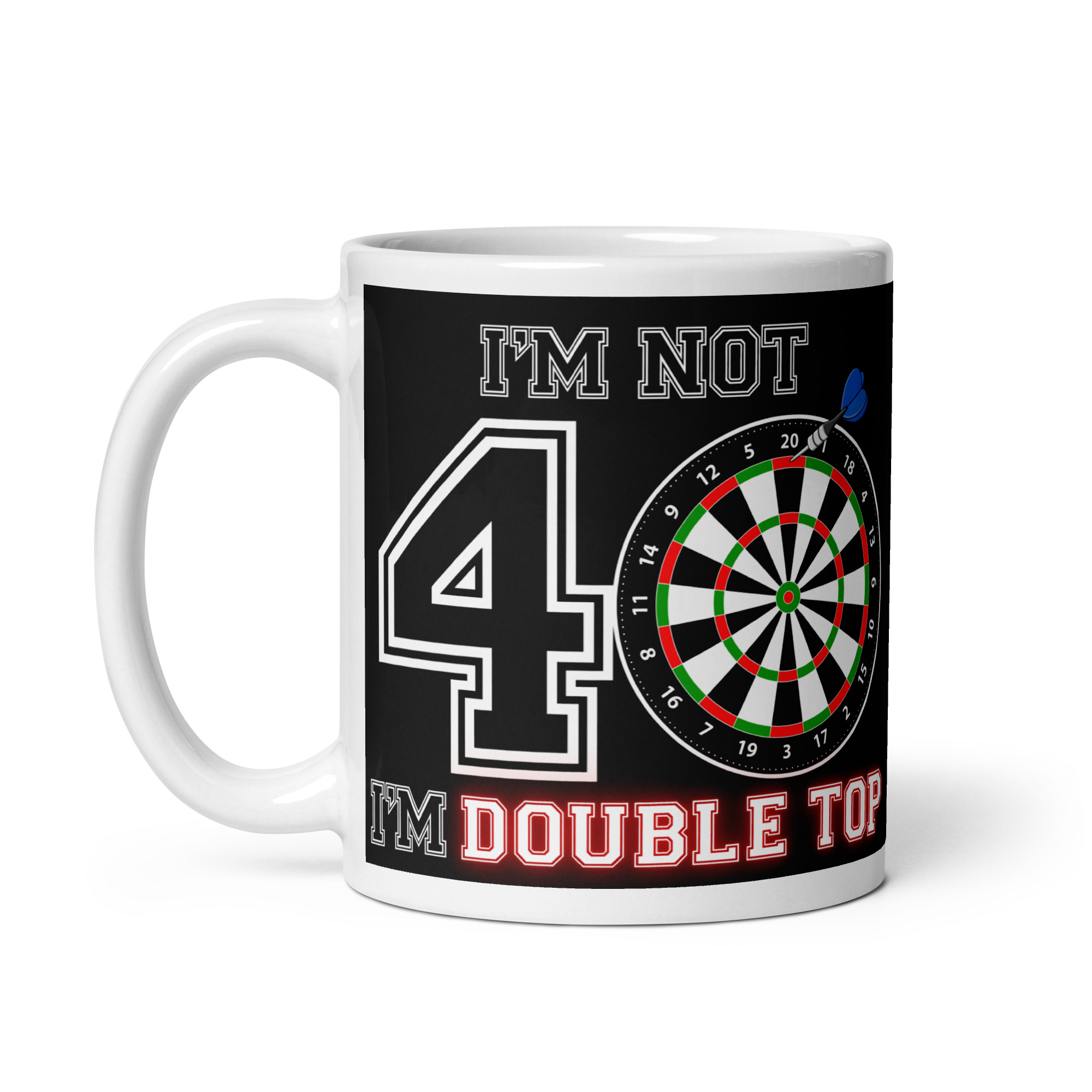 If you are searching for a brilliant gift that blends humour with his favourite pastime, this Darts 40th Birthday Mug is exactly what you need. Turning forty deserves something memorable, and this eye-catching 11oz ceramic mug delivers both laughs and personality. Featuring the bold slogan “I’m Not 40 I’m Double Top” alongside a striking dartboard design with a dart hitting the top score, it cleverly celebrates his milestone in true darting style.