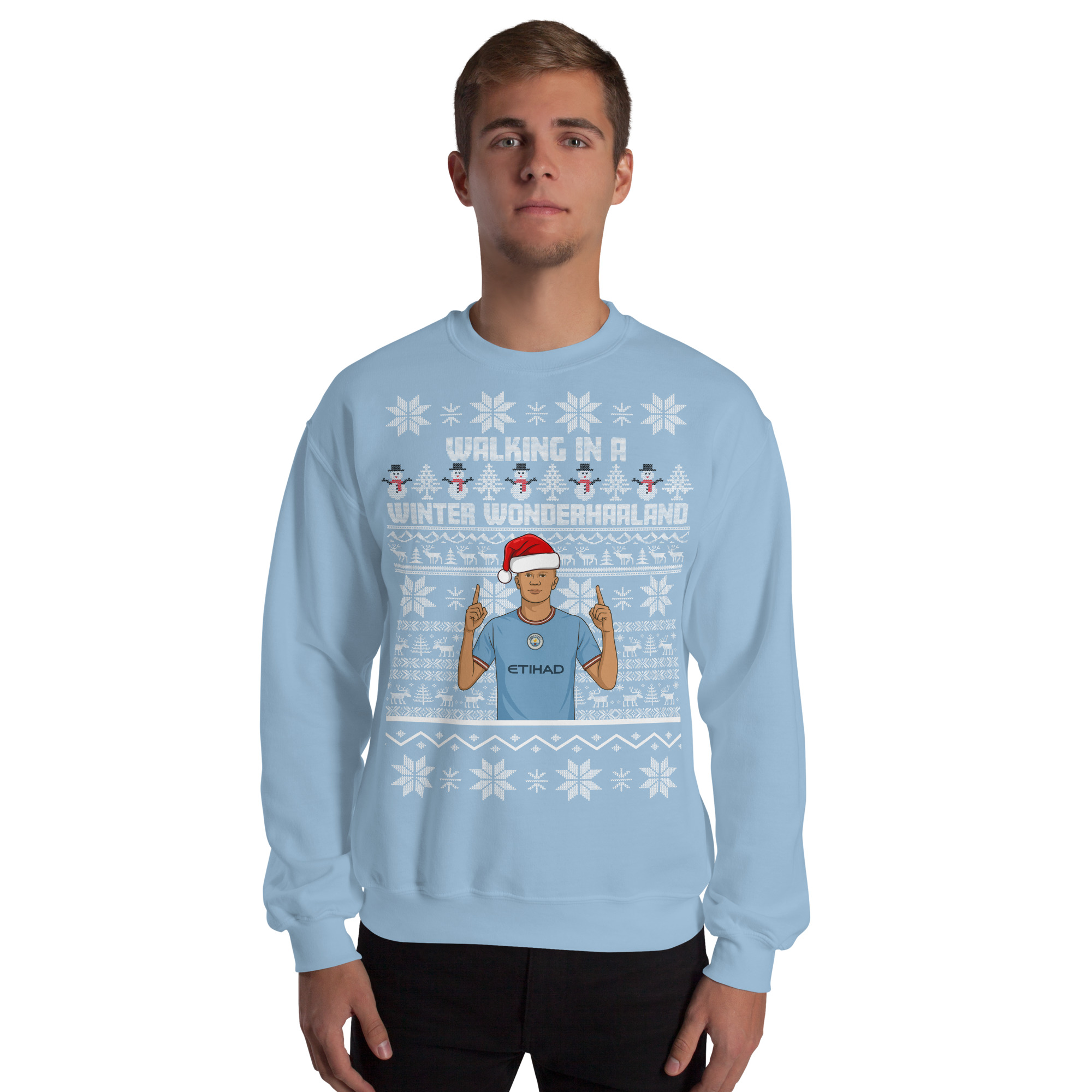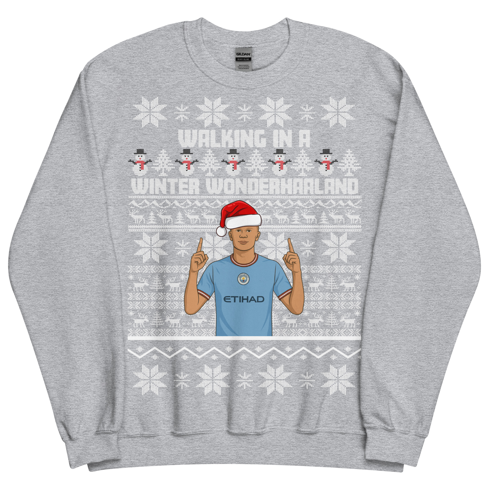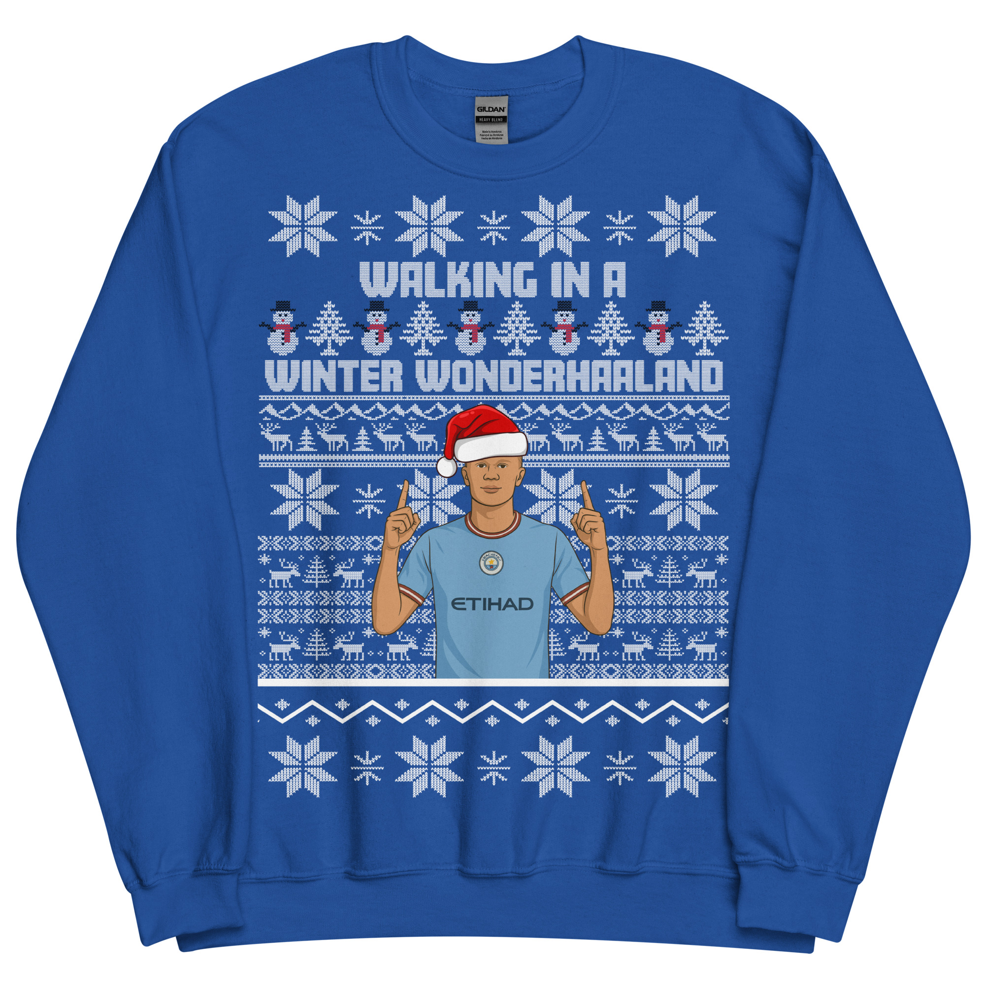 Searching for the ultimate gift for a Manchester City fan this festive season? The Erling Haaland Christmas Jumper featuring the cheeky phrase “Walking in a Winter WonderHaaland” is the perfect way to bring together football passion and holiday cheer. Whether he’s shouting from the terraces or singing carols at the pub, this printed sweatshirt is guaranteed to get a laugh, a nod of approval, and probably a few envious looks from fellow fans.