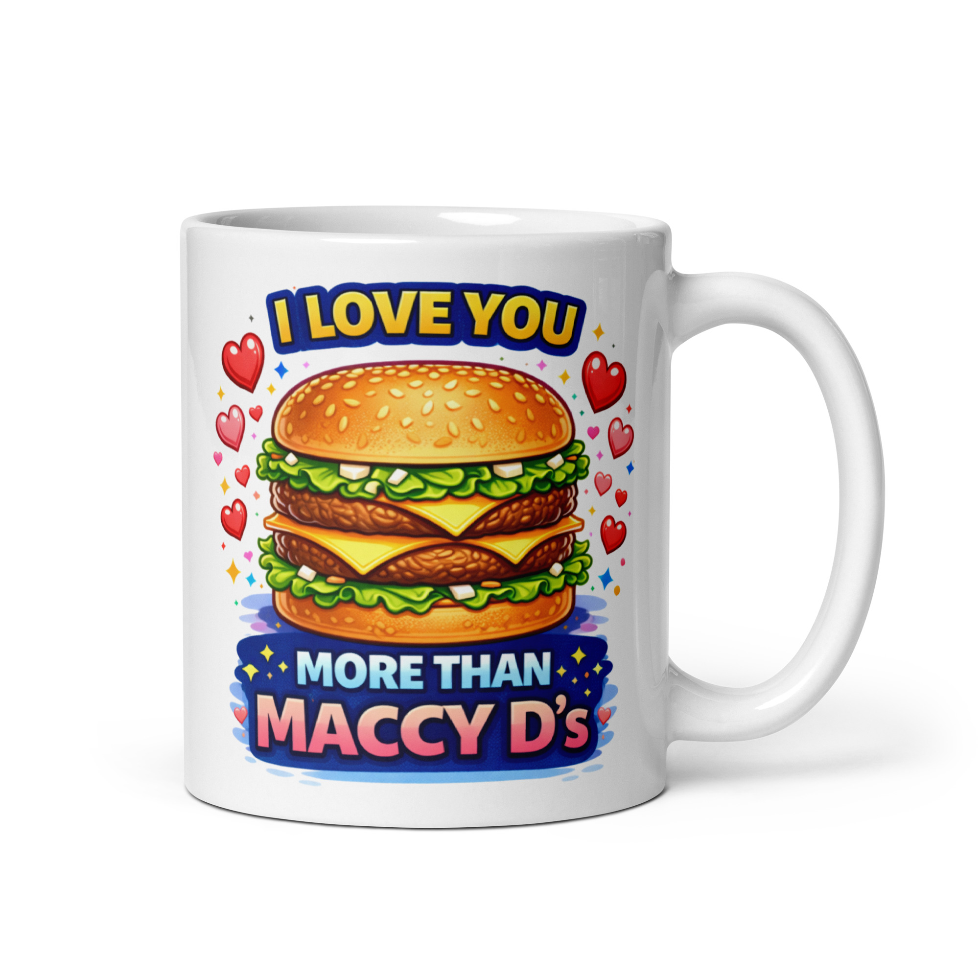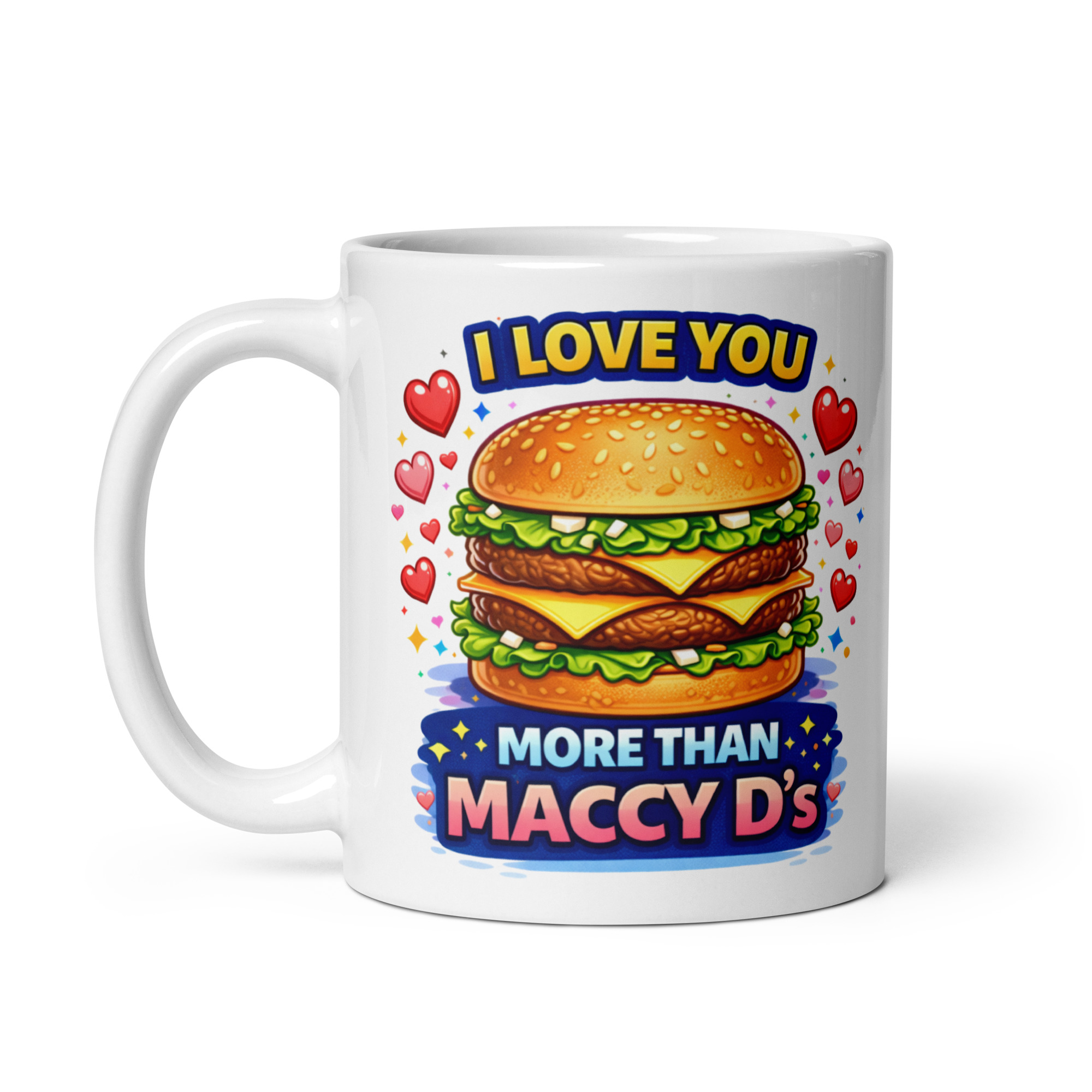 The design is bright and fun, featuring a mouth-watering stacked burger surrounded by hearts and sparkly confetti. At the top it proudly reads “I LOVE YOU”, and then the punchline lands underneath: “MORE THAN MACCY D’S”. It’s a simple message, but it hits perfectly for couples who flirt with banter and show affection through jokes, food, and daily little moments.