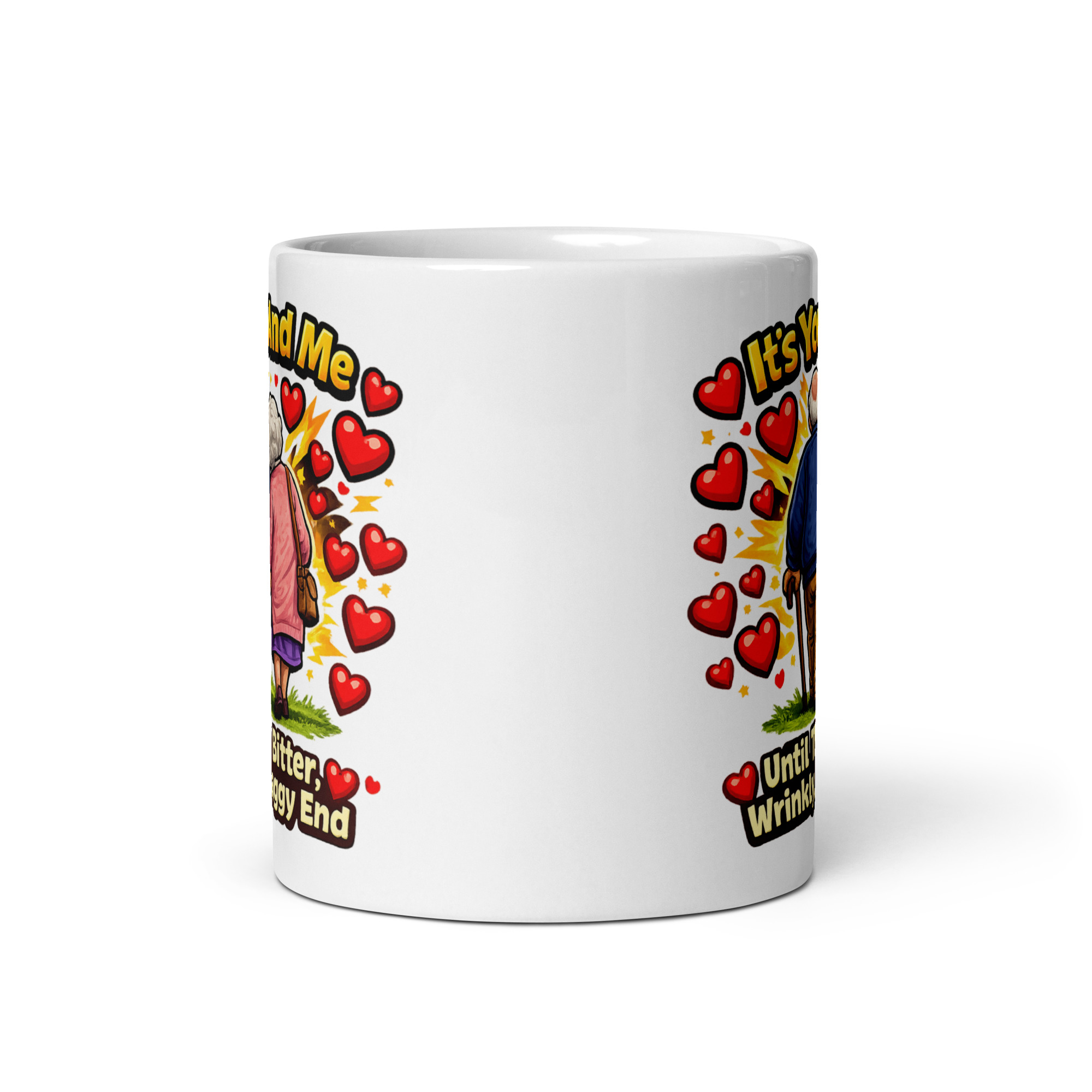 The artwork is genuinely heart-warming with a cheeky twist. It shows an elderly couple strolling away hand-in-hand, surrounded by floating hearts and a burst of bright, celebratory colour. The headline says “It’s You And Me”, and then comes the hilariously honest finish: “Until The Bitter, Wrinkly, Saggy End”. It’s romantic, it’s real, and it’s exactly the sort of humour that lands best in relationships built on banter and proper affection.
