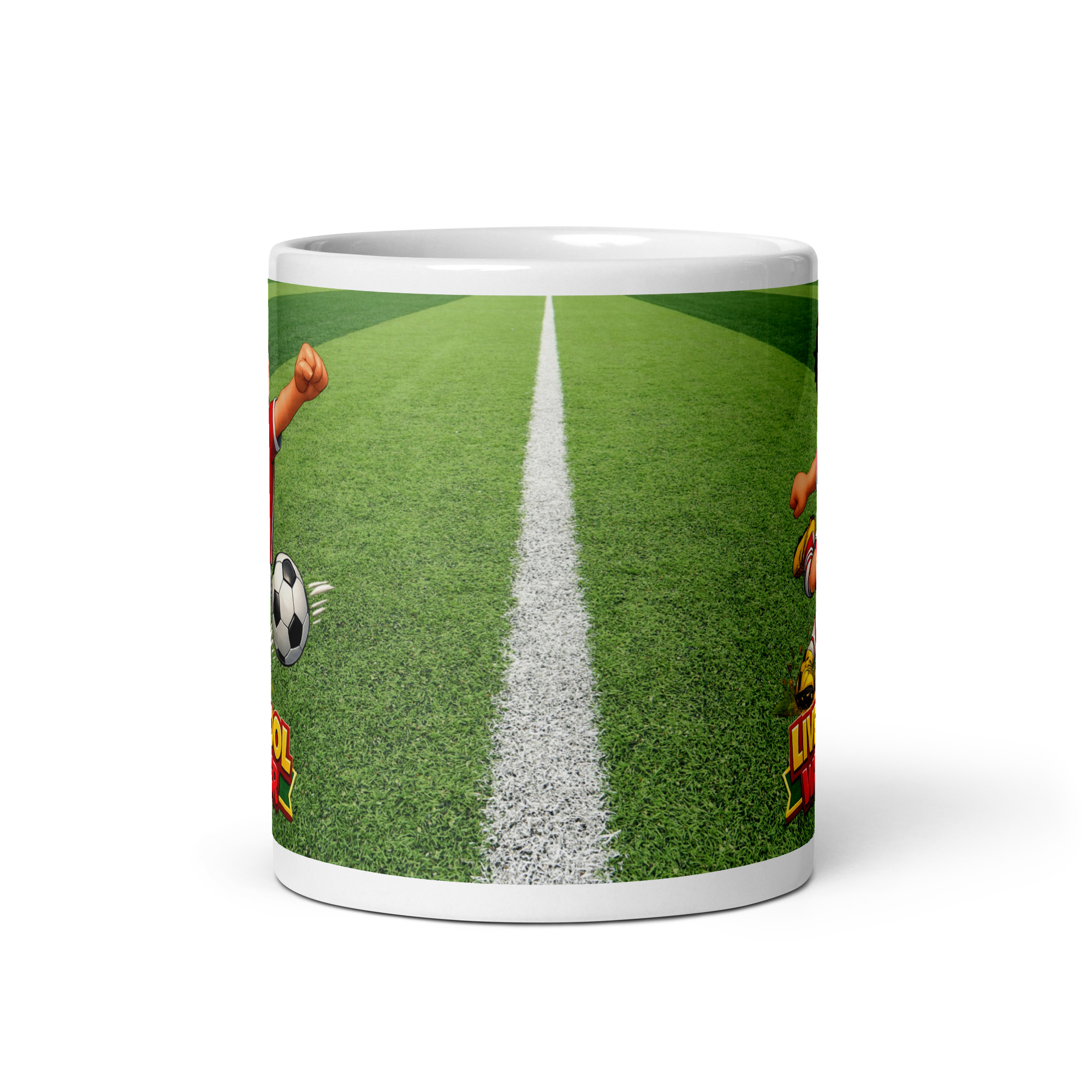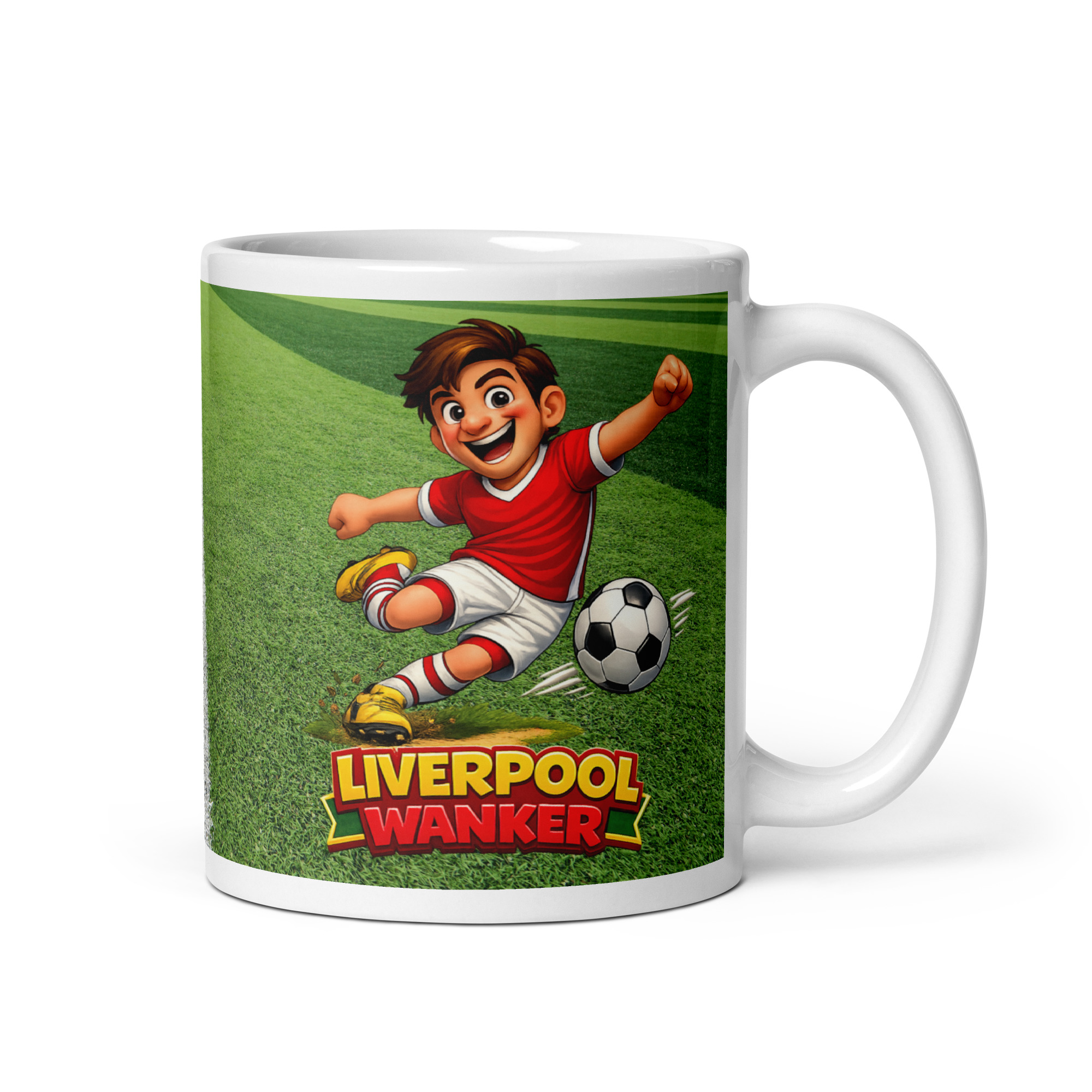 The illustration on the mug shows a lively cartoon footballer mid-kick, bursting with confidence and energy. Set on a vivid green pitch, the character captures the excitement of matchday while keeping the overall feel light-hearted and fun. The bright red kit ties in perfectly with the theme, while the exaggerated style ensures the mug feels humorous rather than hostile. The slogan sits proudly beneath the artwork, making the message clear and impossible to ignore.