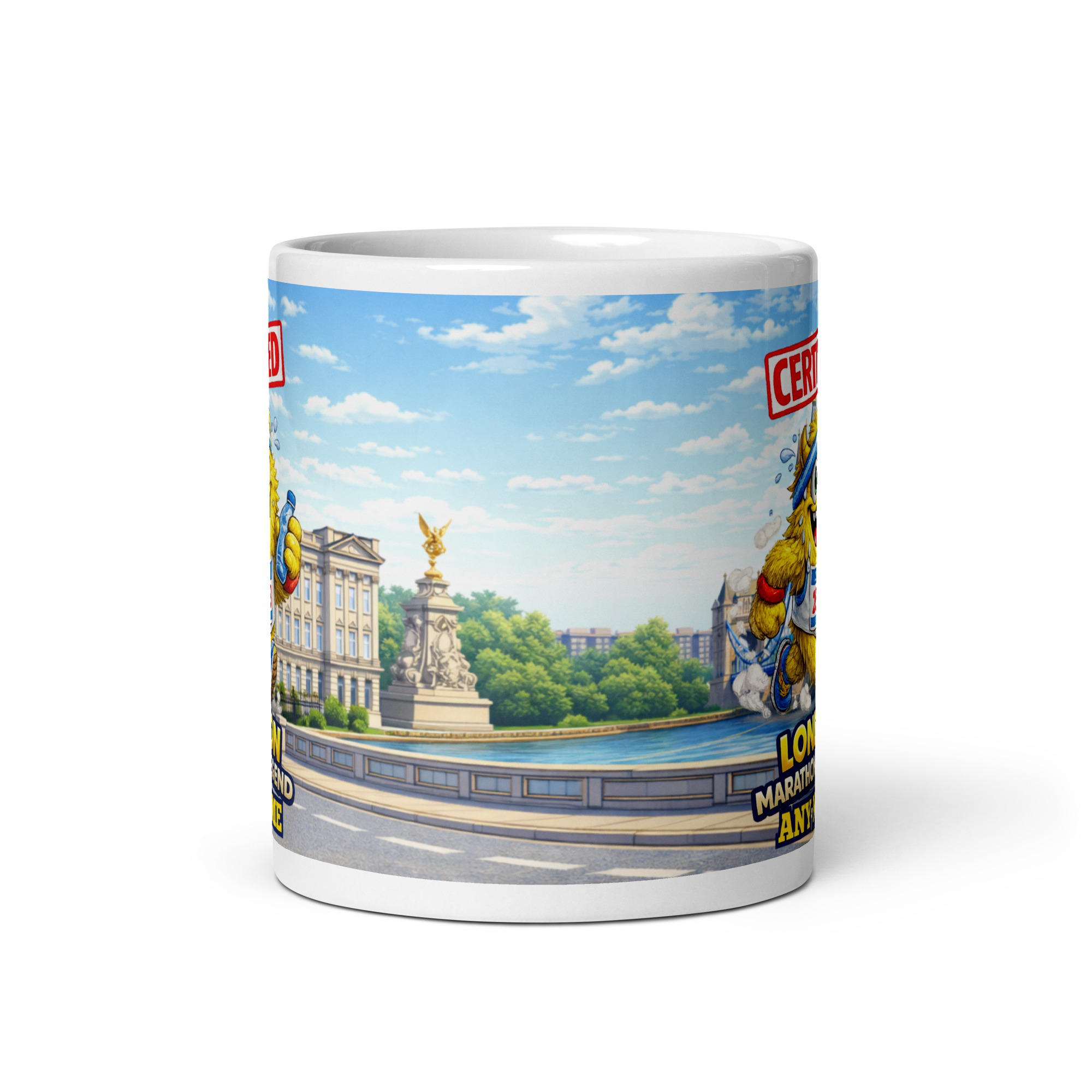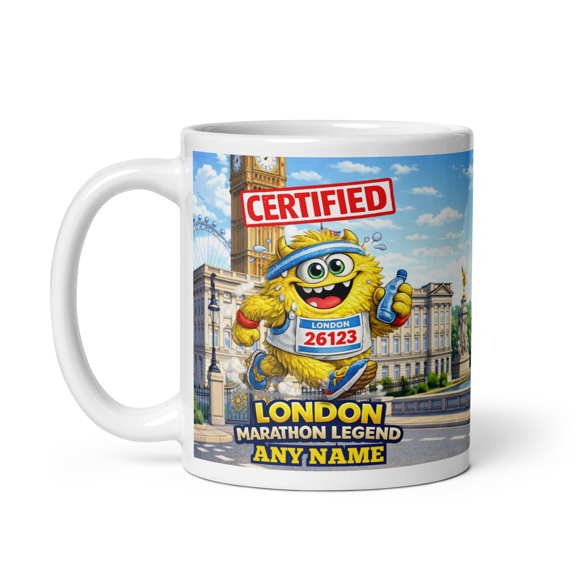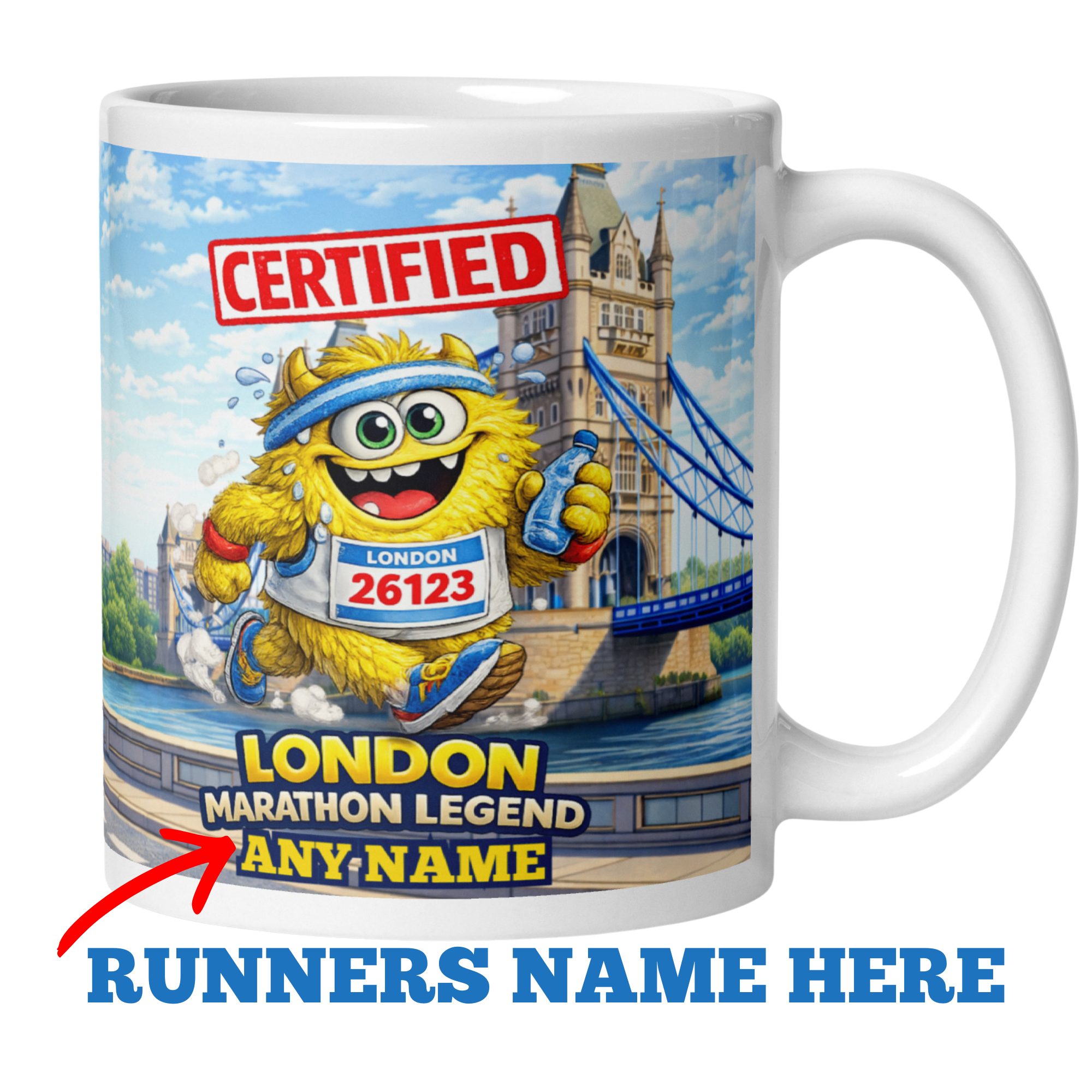 The mug features a cheerful running character proudly making their way past the iconic Tower Bridge, one of the most recognisable landmarks on the London Marathon route. Above the runner sits the bold “Certified” stamp, while the wording “London Marathon Legend” highlights the incredible accomplishment. At the bottom of the design, the runner’s name can be added, making this a unique and thoughtful gift that celebrates their marathon success.
