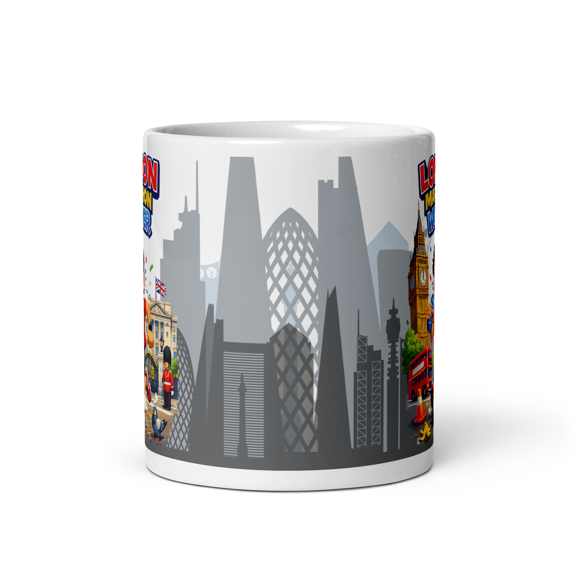 The bright, detailed illustration stands out beautifully against the crisp white ceramic. The vibrant reds, blues and yellows bring the London backdrop to life, giving the mug a premium look and feel. It is humorous, yes, but it is also thoughtfully designed and visually striking.