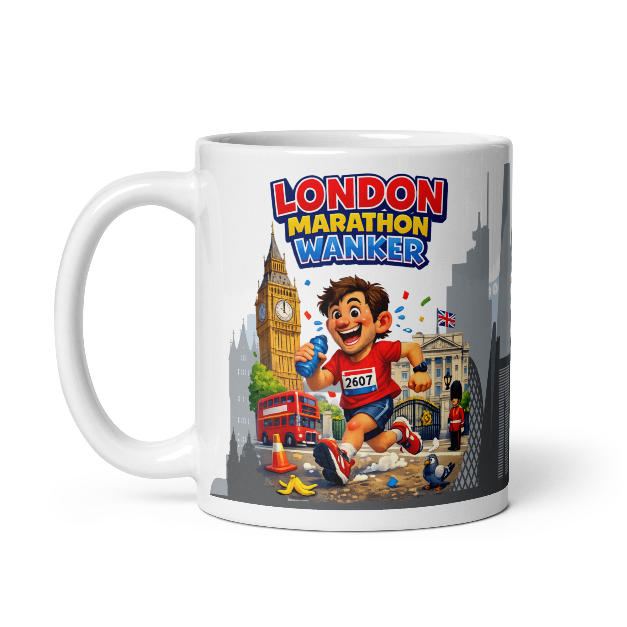 The artwork bursts with energy. A wide-eyed runner charges through the streets of London, race number pinned to his chest and water bottle in hand. Behind him, iconic landmarks set the scene perfectly, from the towering clockface of Big Ben to the unmistakable London Eye. A red double-decker bus rolls by, a royal guard stands to attention and even a pigeon looks on as our marathon hero dashes past a rogue banana skin. Above it all, bold lettering proudly declares “London Marathon Wanker”, making the joke loud, playful and impossible to miss.
