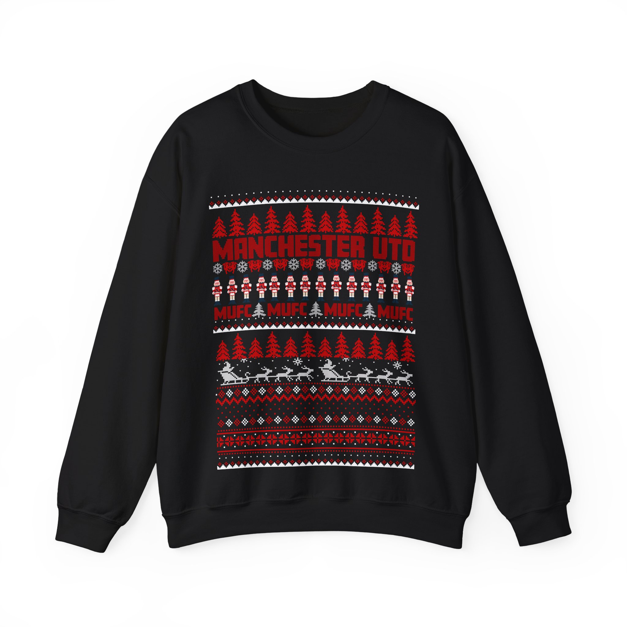 The Manchester United Christmas Jumper is the perfect festive garment for passionate Manchester United fans, bringing together the iconic Red and White colours with classic Christmas charm. Styled to look like a traditional knitted Christmas jumper, this modern printed sweatshirt is adorned with festive images, including snowflakes, Santa, Christmas trees, and nutcrackers. Across the chest, the bold “MANCHESTER UTD” and “MUFC” lettering proudly represent the club, making this jumper a must-have for any supporter eager to show off their allegiance during the holiday season. Available in black or grey and in sizes ranging from S to 3XL, this jumper is the ideal way to combine club loyalty with seasonal cheer.
