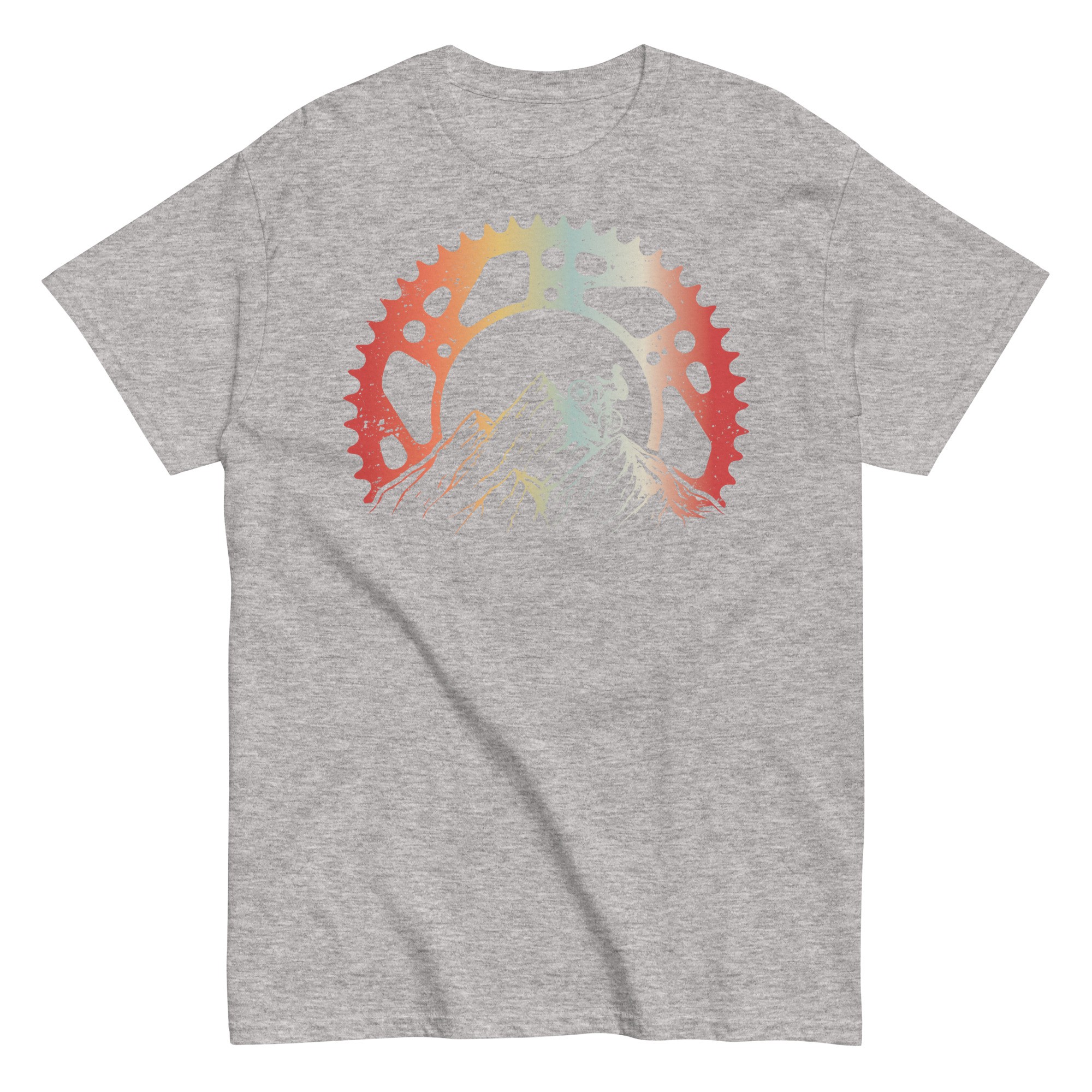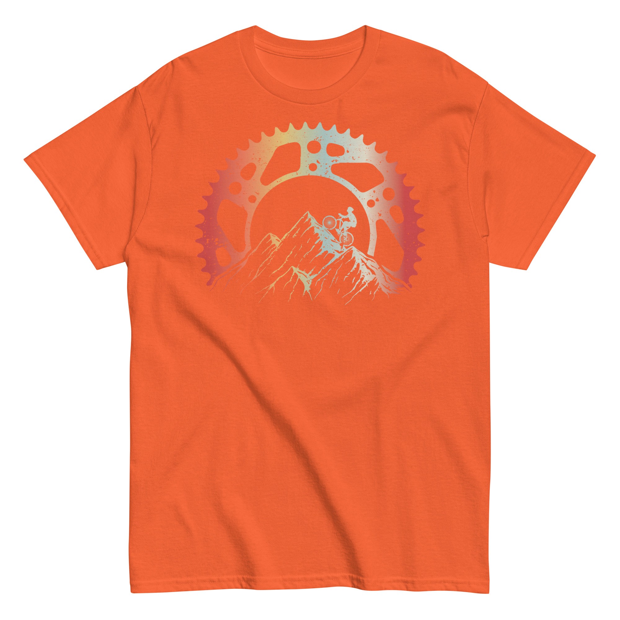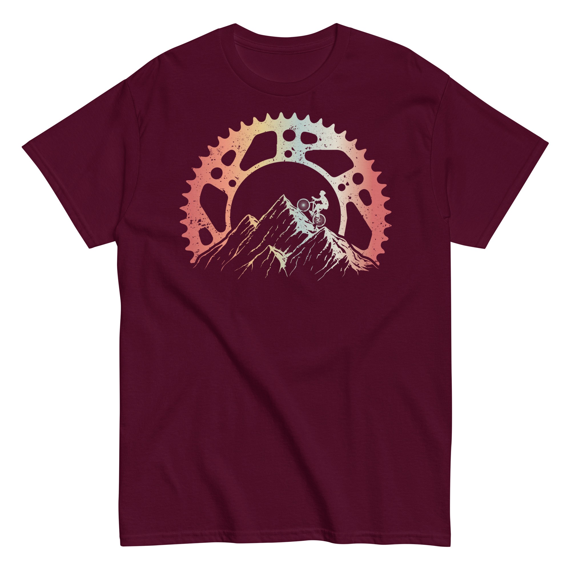At the heart of this t-shirt is a powerful scene: a lone rider silhouetted against jagged peaks, framed by a burst of colour in the shape of a bicycle cog turned sunset. It’s a striking visual that celebrates the beauty and intensity of mountain biking – that perfect mix of grit and grandeur.