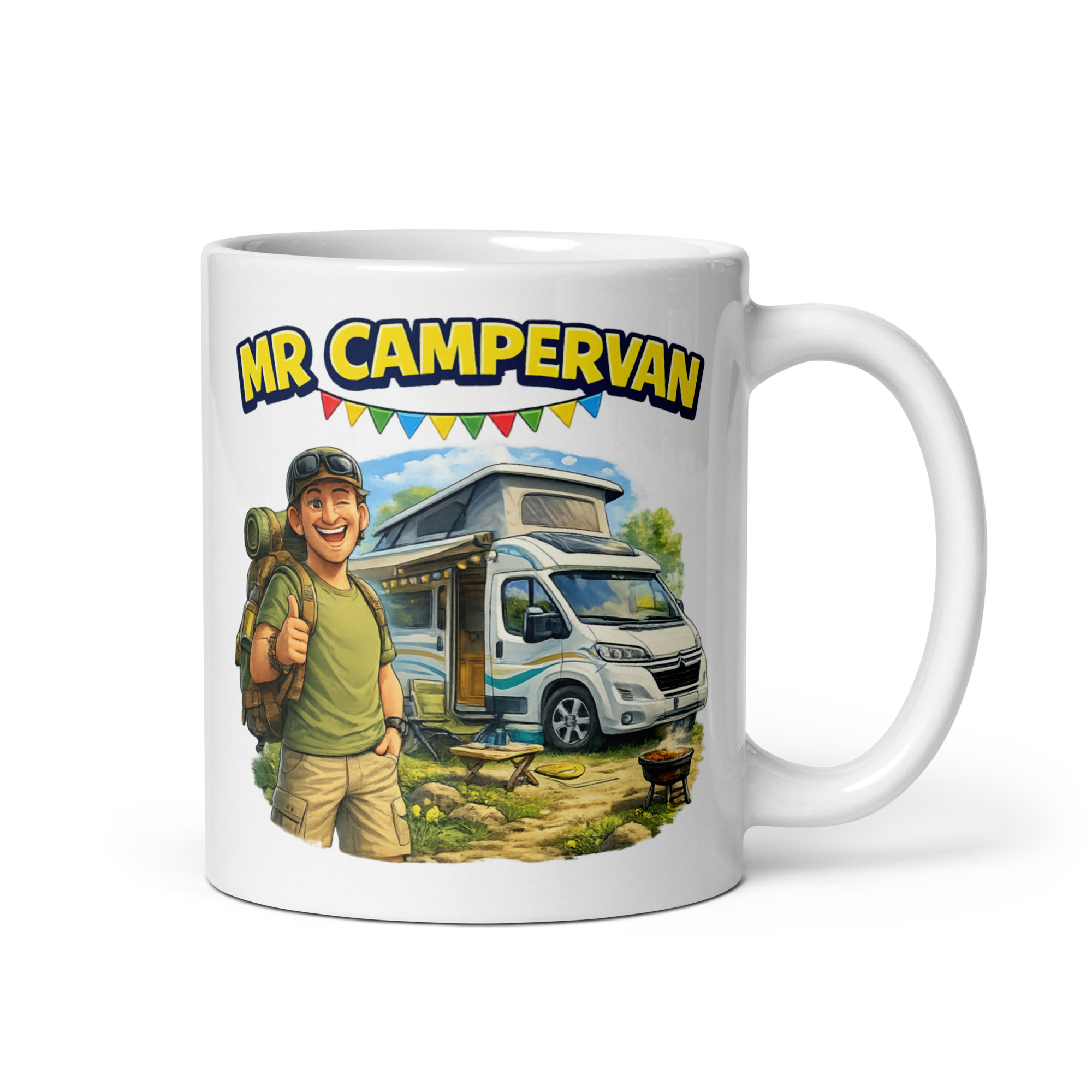 The design instantly captures that sense of freedom. A cheerful, adventure-loving character stands proudly in front of his beloved campervan, backpack on and thumbs up at the ready. Bunting flutters above, the van door is open, and a barbecue waits nearby, ready for the evening feast. It is a scene every campervan owner recognises and loves. The bold “Mr Campervan” headline sits confidently above the artwork, making it clear that this mug belongs to a true road trip enthusiast.