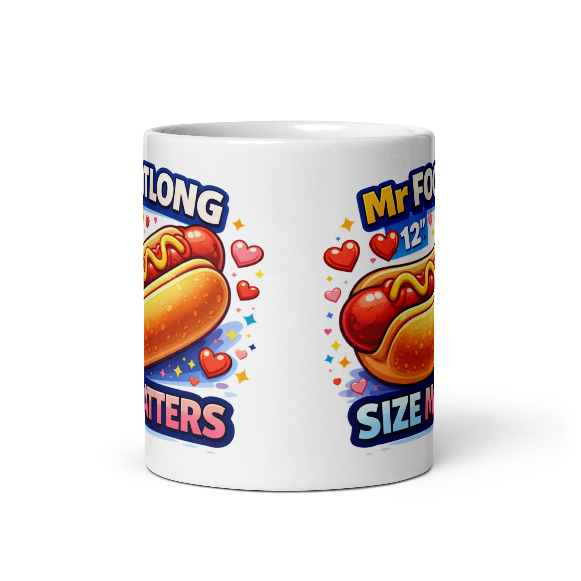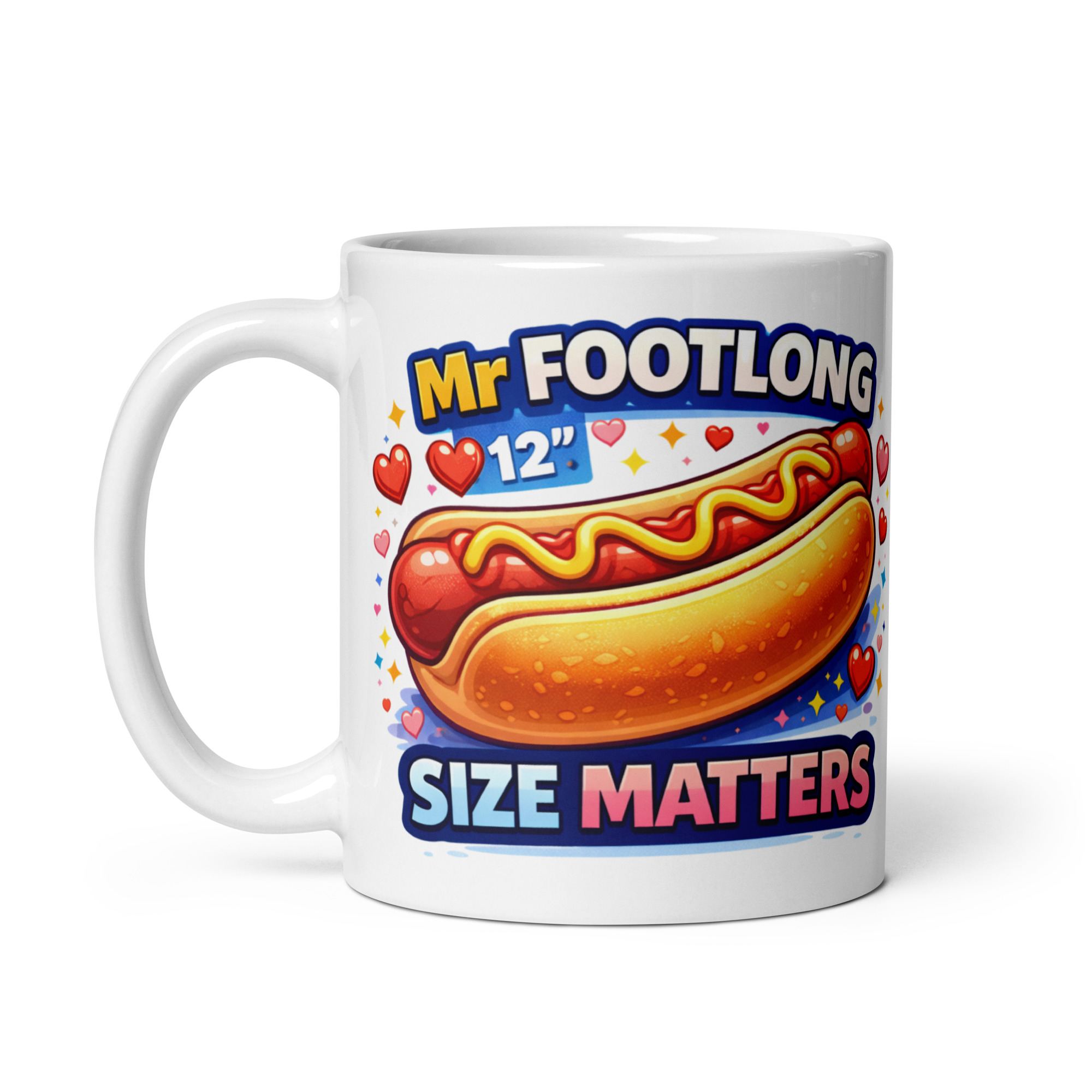 The design features a juicy illustrated hot dog smothered in mustard, surrounded by hearts and sparkly details. Across the top, it proudly reads “Mr Footlong 12” and underneath comes the punchline “SIZE MATTERS” in big, colourful lettering. It’s outrageous, suggestive, and completely tongue-in-cheek – exactly the sort of gift that’ll make him laugh out loud the moment he unwraps it.
