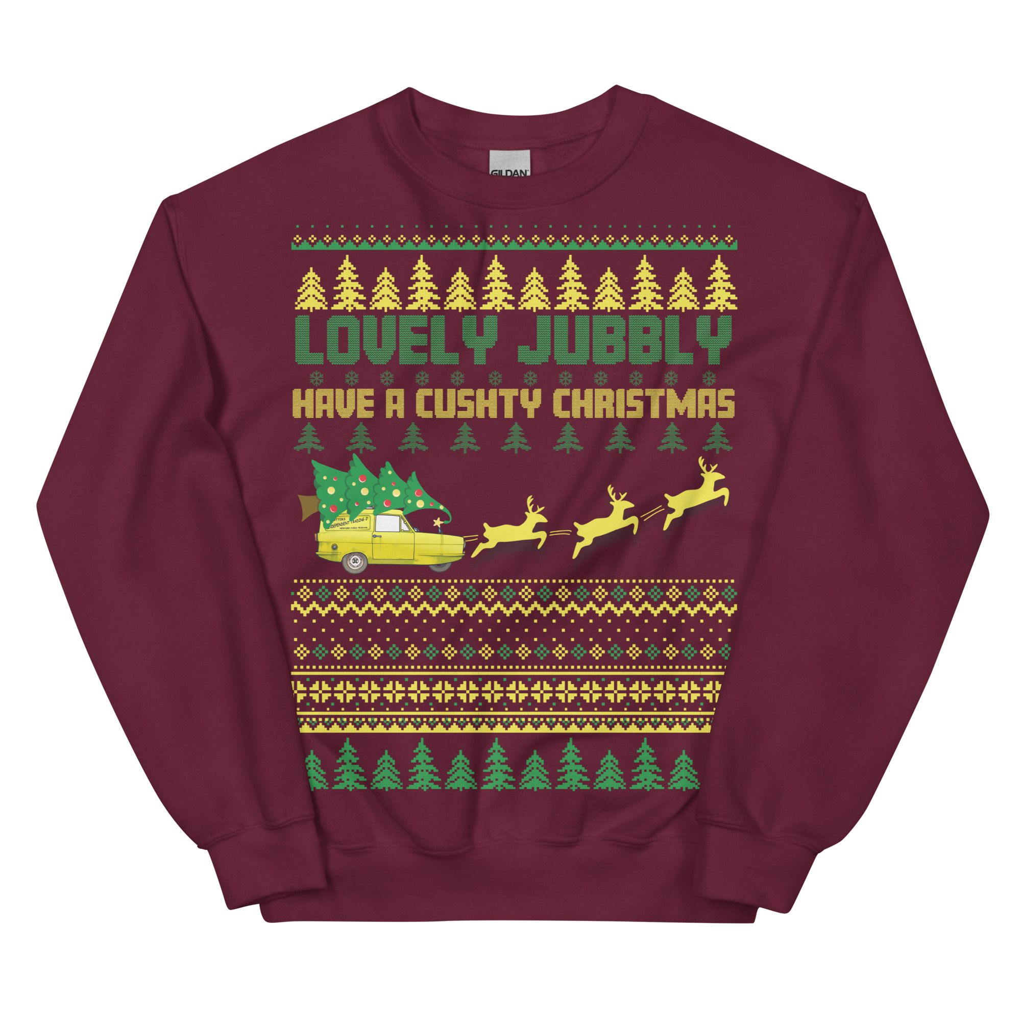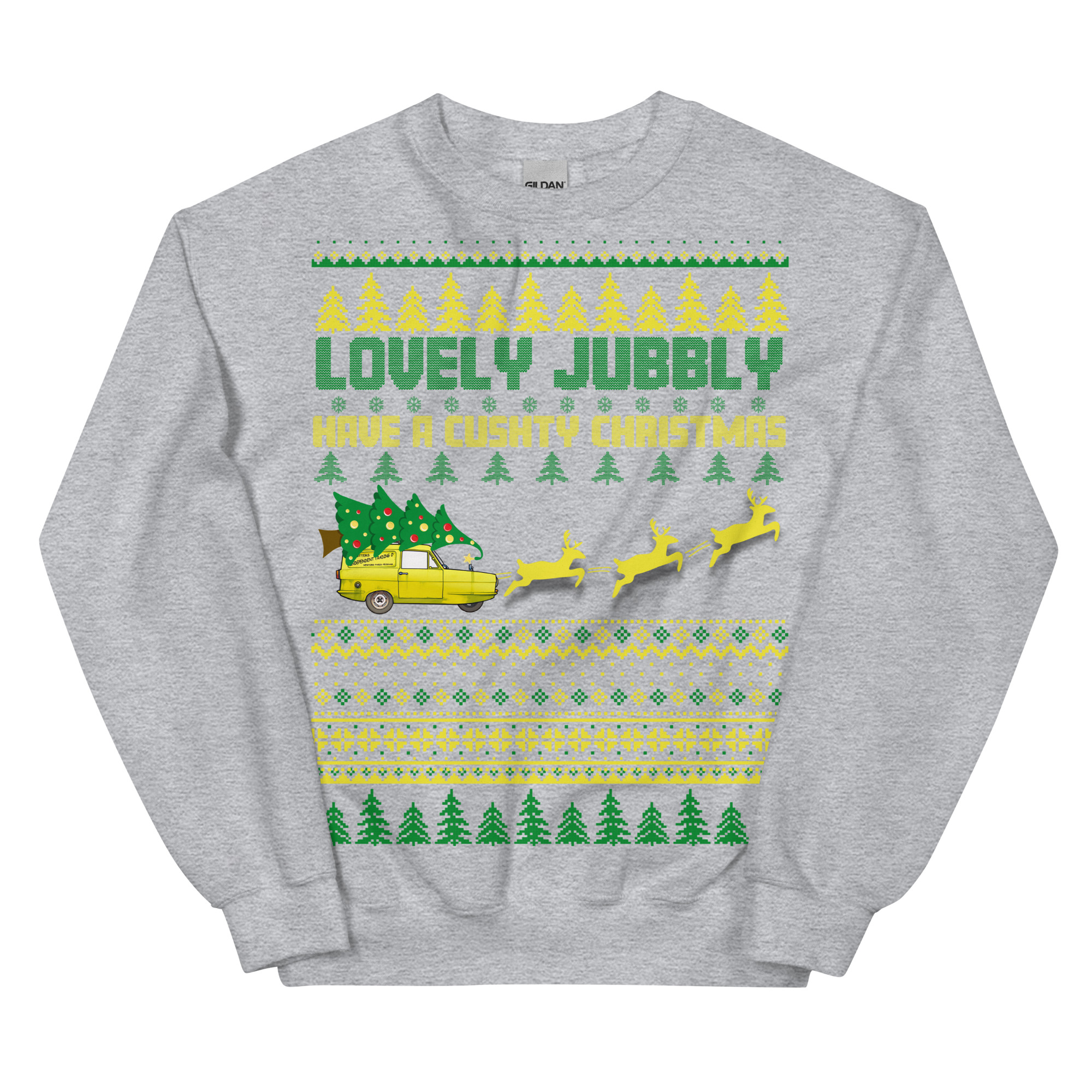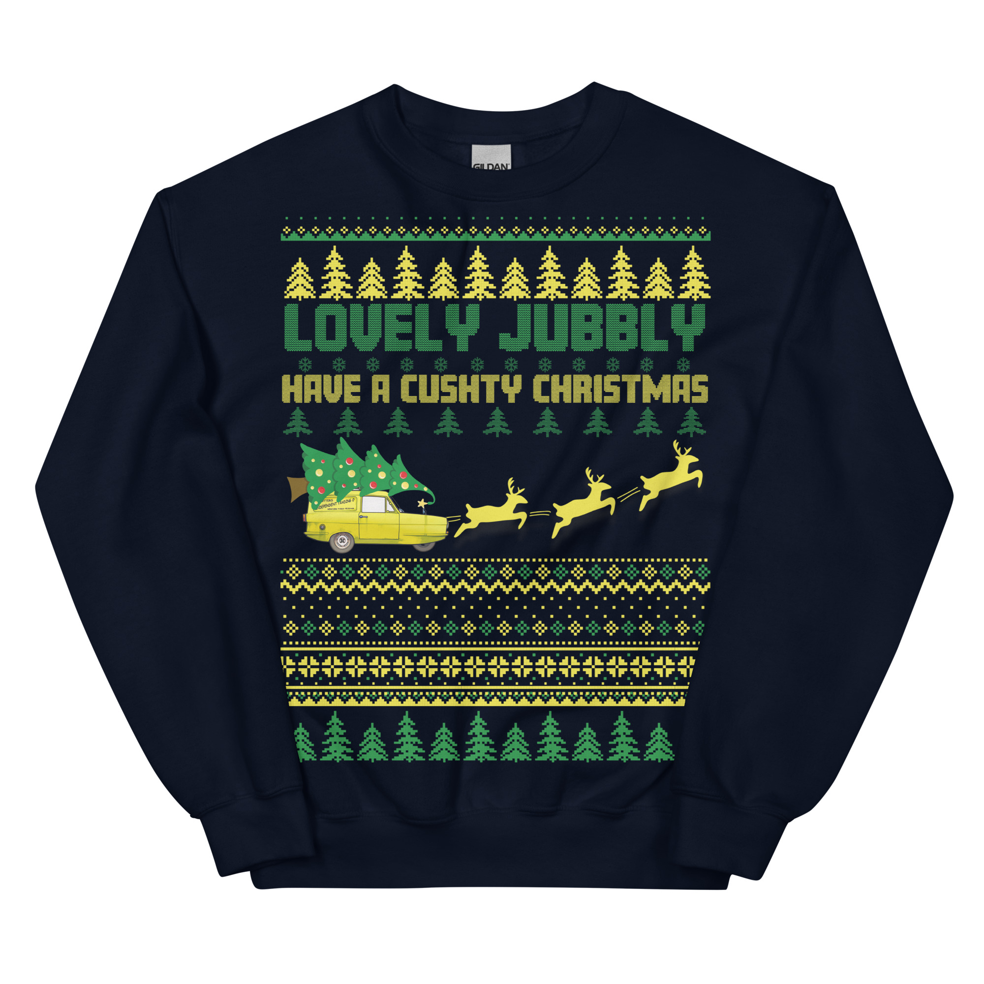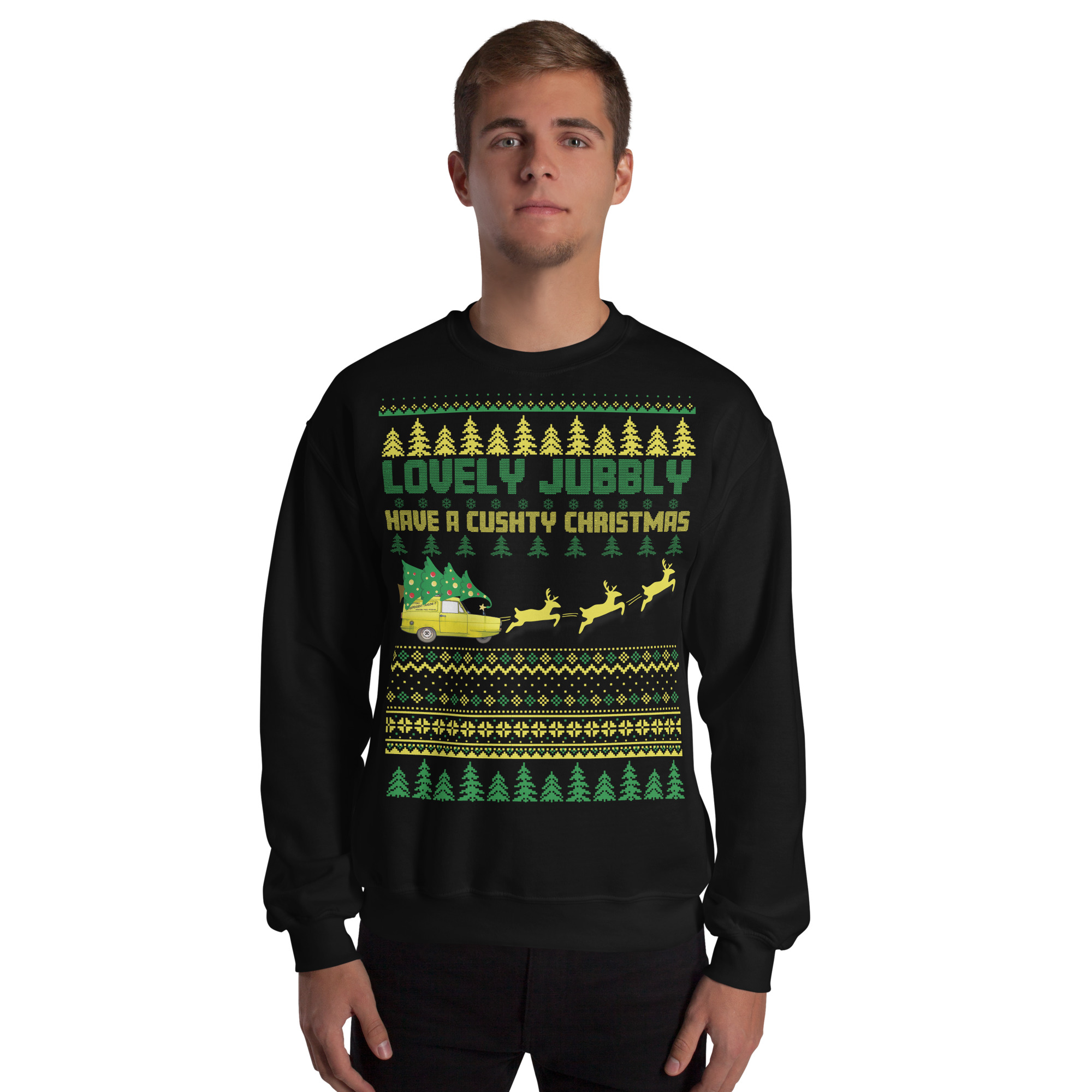 The Only Fools & Horses Christmas Jumper is the ultimate festive attire for fans of the classic British comedy. This jumper combines the beloved charm of Del Boy and his classic catchphrases with traditional Christmas motifs like snowflakes and Christmas trees, creating a look that’s both nostalgic and full of festive cheer. Across the front, the playful text reads “LOVELY JUBBLY HAVE A CUSHTY CHRISTMAS” – words that any Only Fools & Horses fan will recognise as signature Del Boy expressions. Complete with the iconic three-wheeler yellow van being pulled by three reindeer, this is designed to resemble a classic knitted jumper, this sweatshirt offers a modern, comfortable fit with a traditional Christmas jumper style. Available in a range of colours and sizes from S to 5XL, it’s the perfect way to show your appreciation for British comedy and celebrate the season in style.
