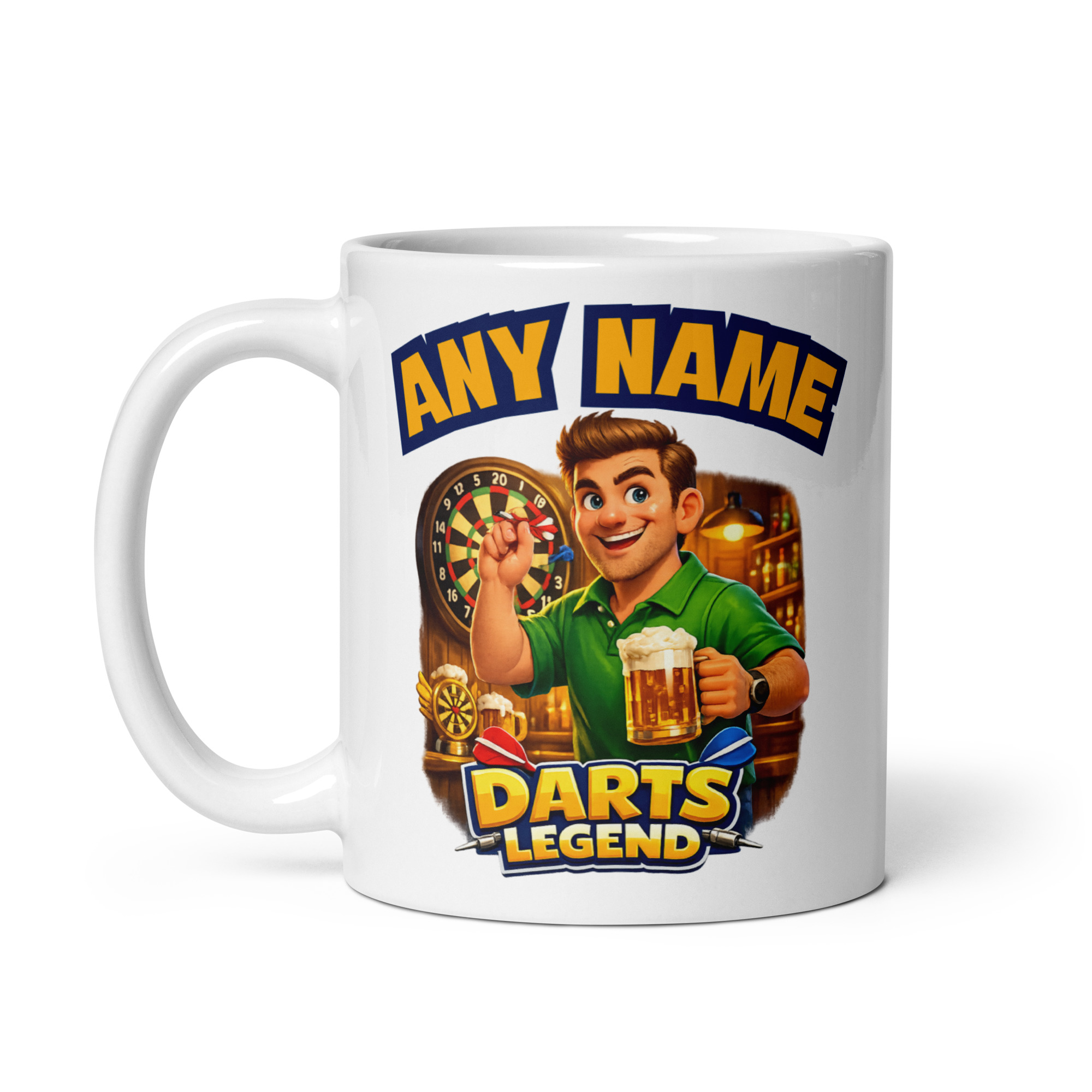 The design bursts with personality. A smiling darts enthusiast stands proudly in front of a classic dartboard, pint in hand, ready to hit the winning double. Beneath him, the strong “Darts Legend” wording stands out in vibrant colours, framed by crossed darts for that authentic finishing touch. Above the action, you can personalise the mug with his name in large, eye catching lettering. Because of this, Personalised Darts Legend Mugs transform an everyday brew into a statement piece.