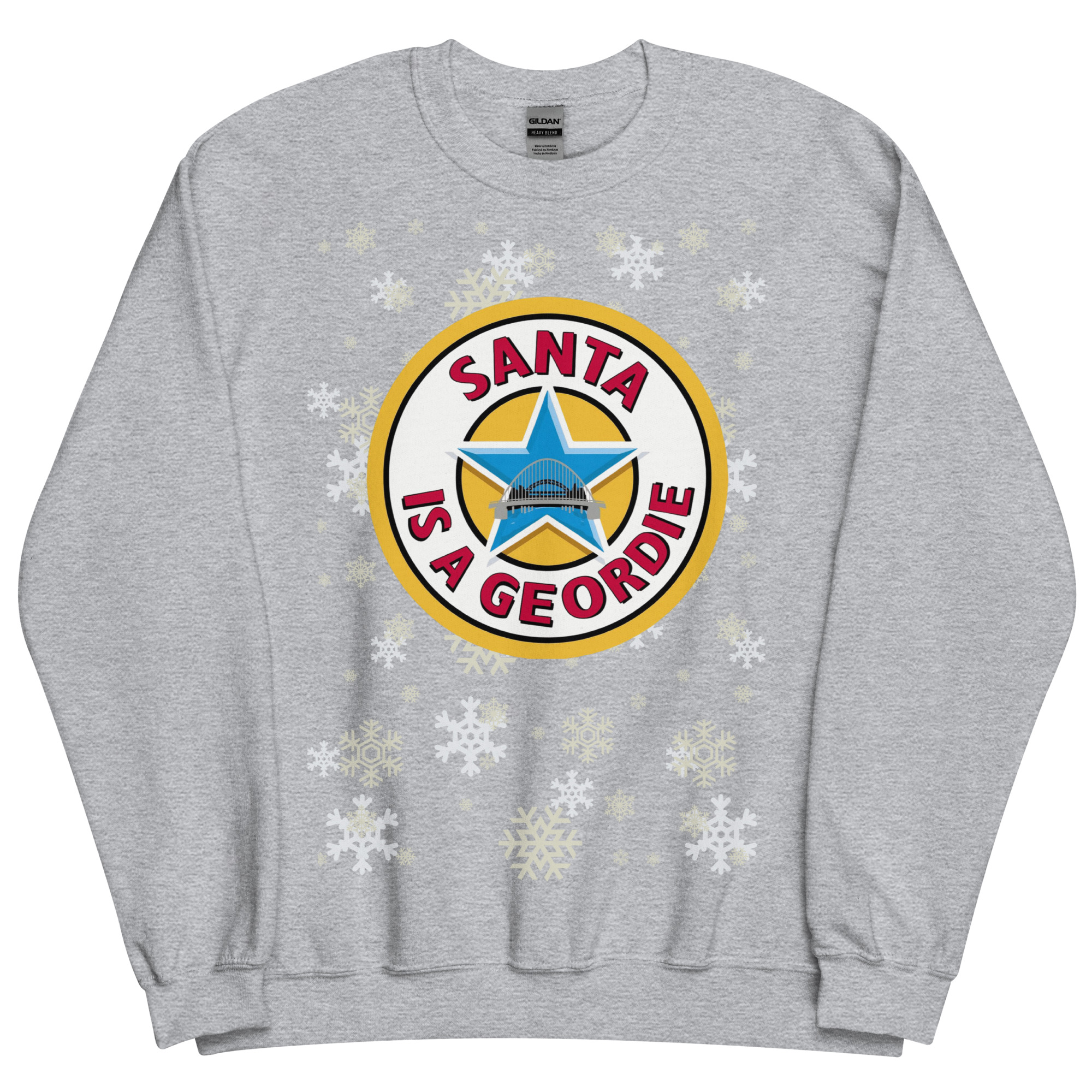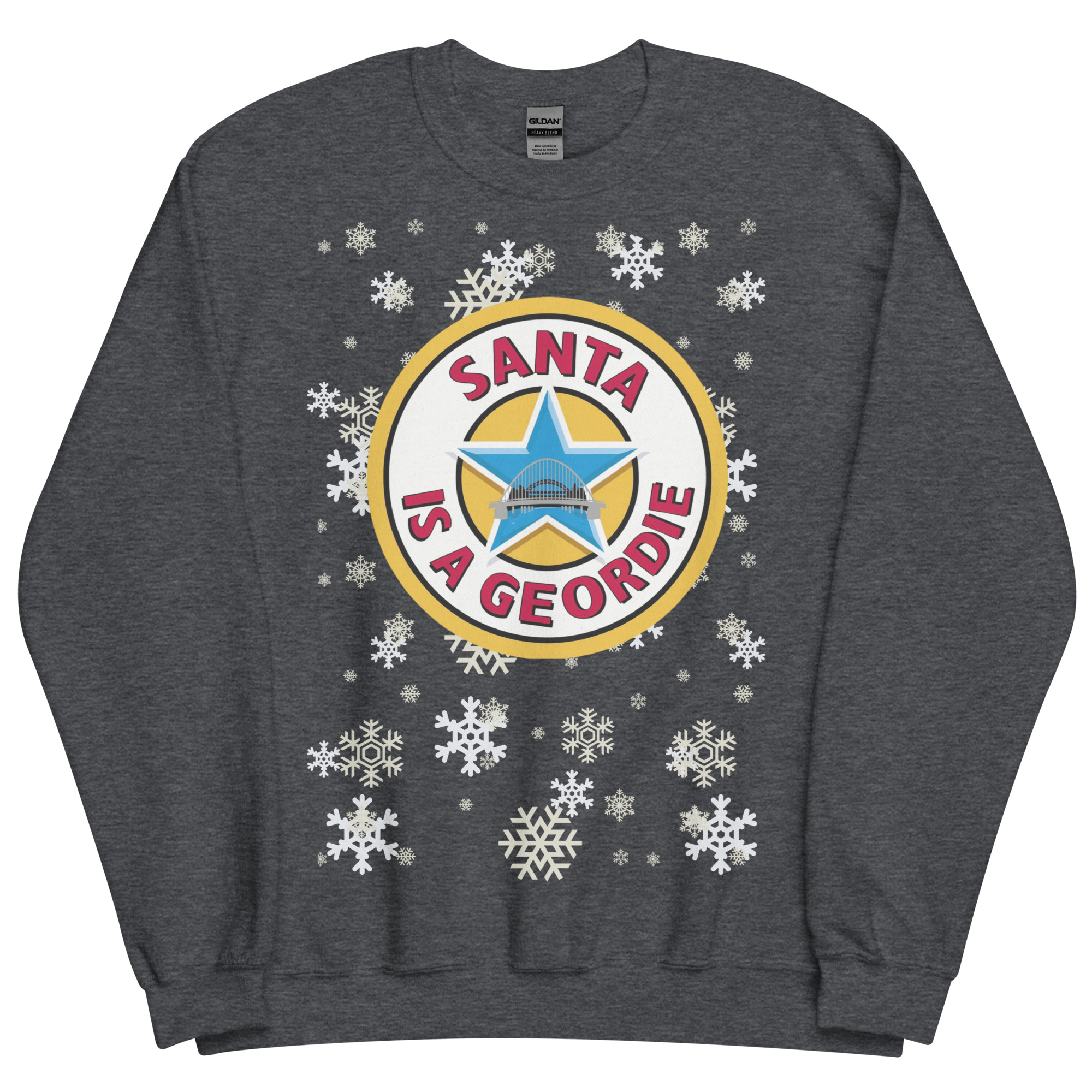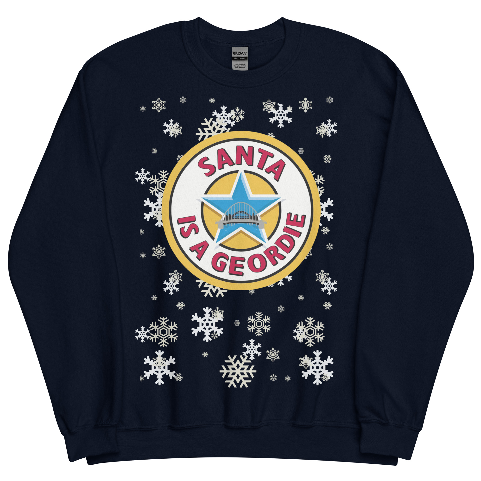 Set against a snowy backdrop of falling white snowflakes, the striking circular logo takes centre stage. With bold lettering, a classic blue star, and a nod to the famous Tyne Bridge, the message is unmistakable – and brilliant. It’s a design that’s instantly recognisable to anyone from Tyneside, combining football, heritage, and humour in one gloriously festive package.