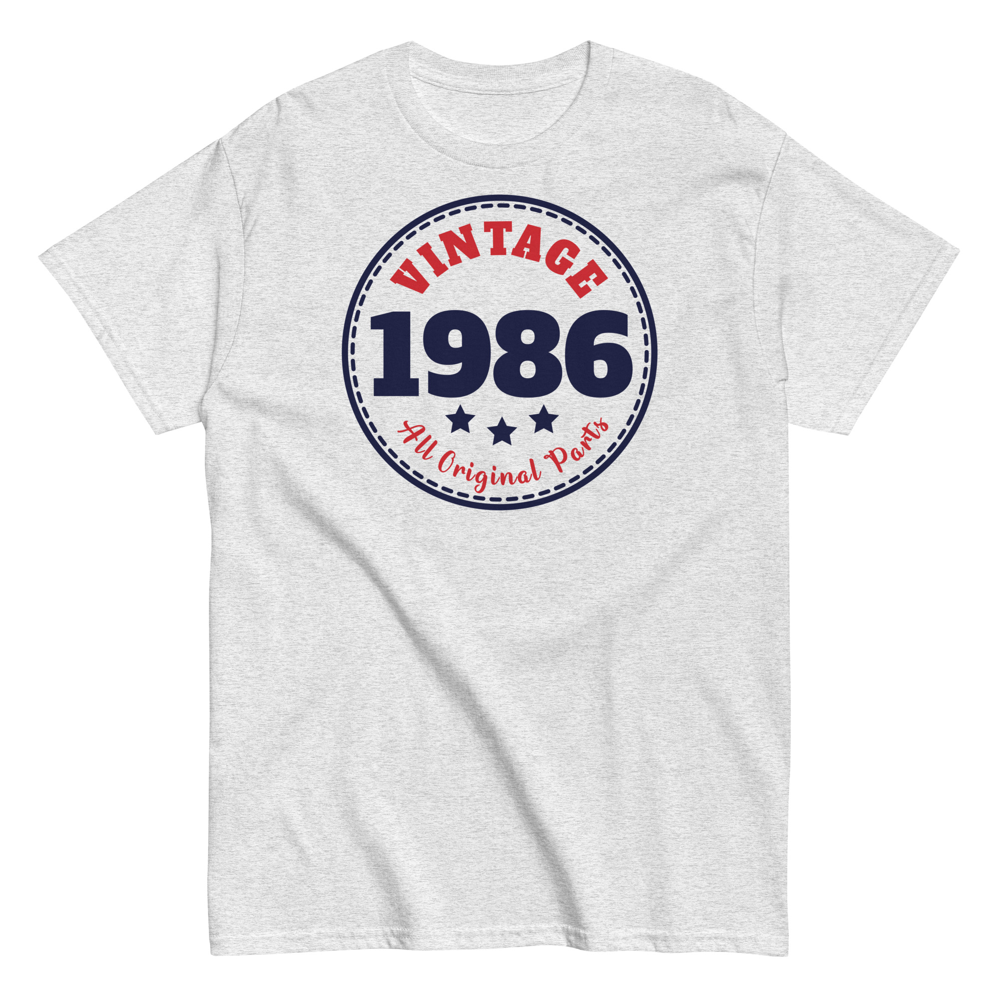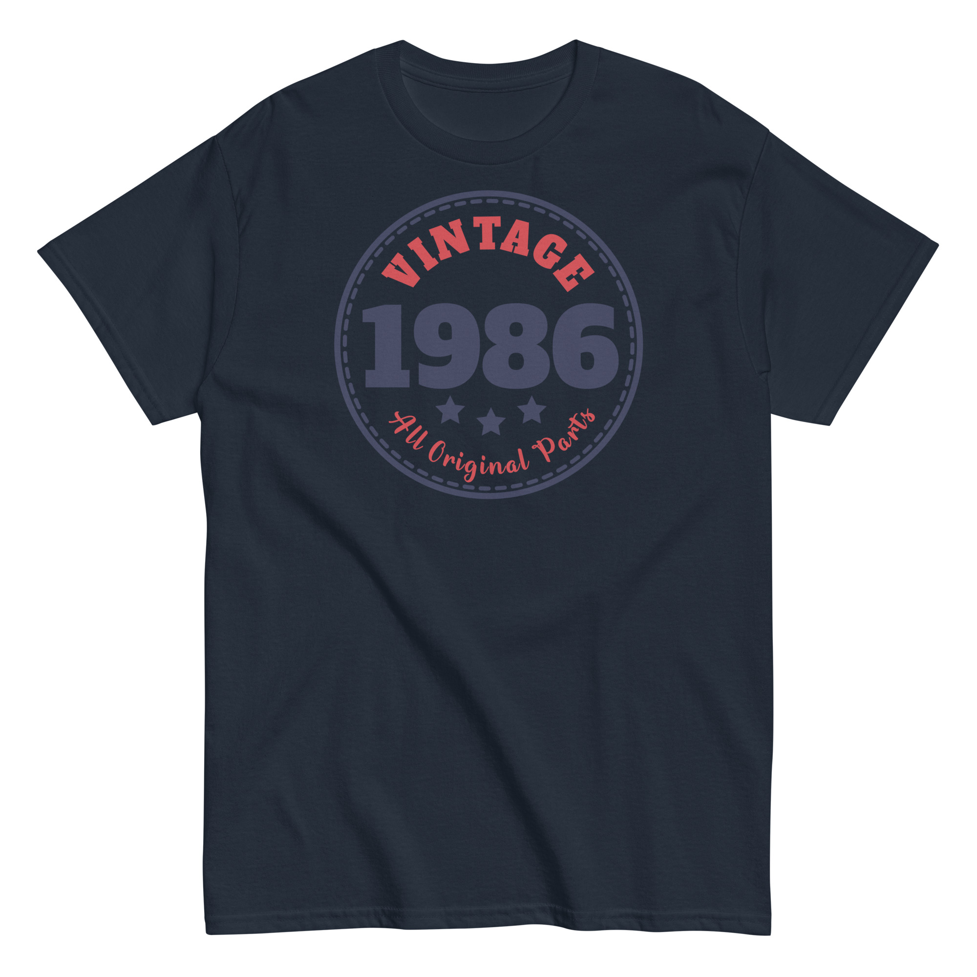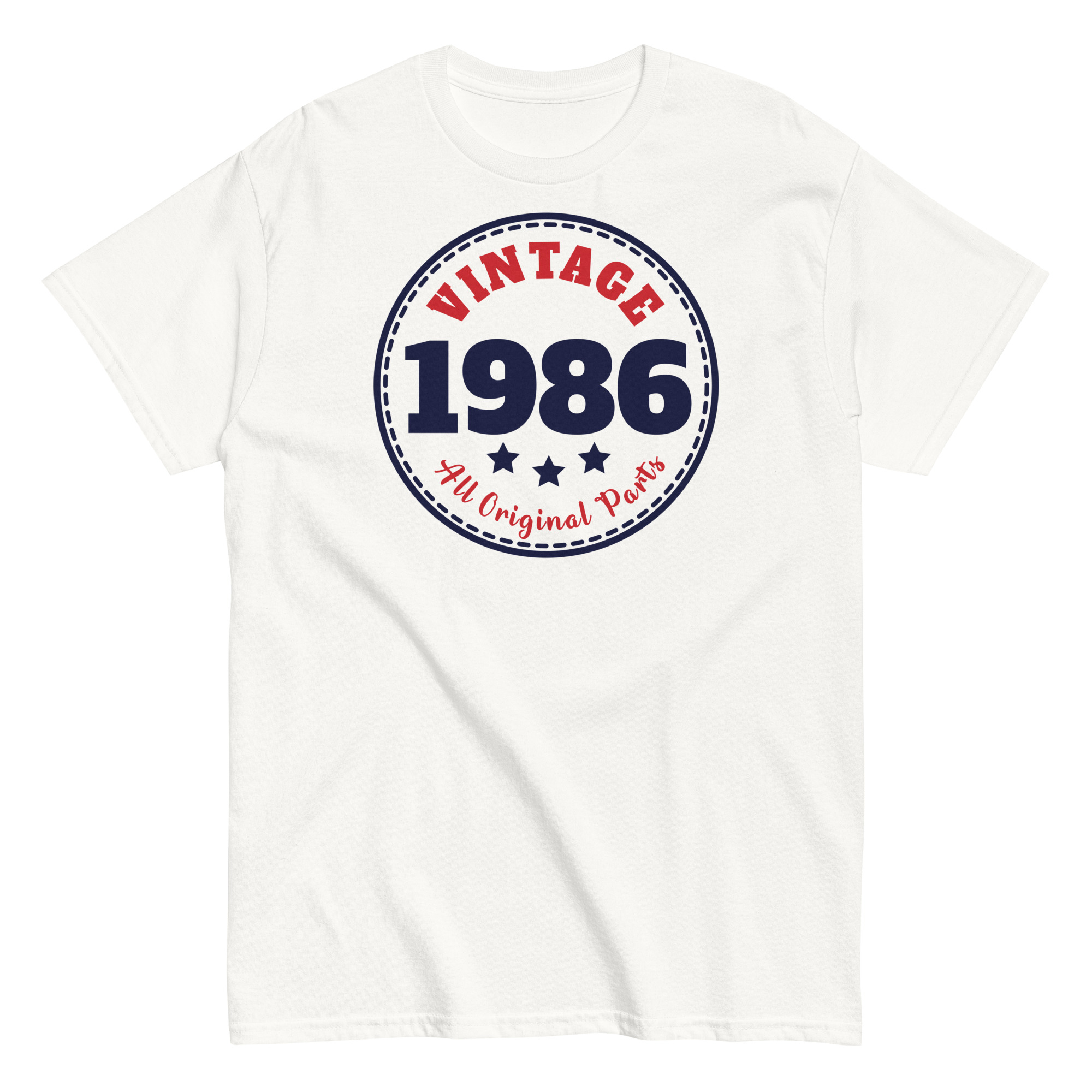 Designed in a circular emblem style, these vintage Birthday T-shirts showcases “Vintage 1986” in bold, navy blue and red print – surrounded by stars and stitched-style borders. It’s a subtle throwback to classic badge logos, giving the tee a crisp, old-school charm that feels anything but outdated. The words “All Original Parts” underline the message with a playful wink, making this the kind of shirt that gets compliments – and chuckles – wherever he wears it.