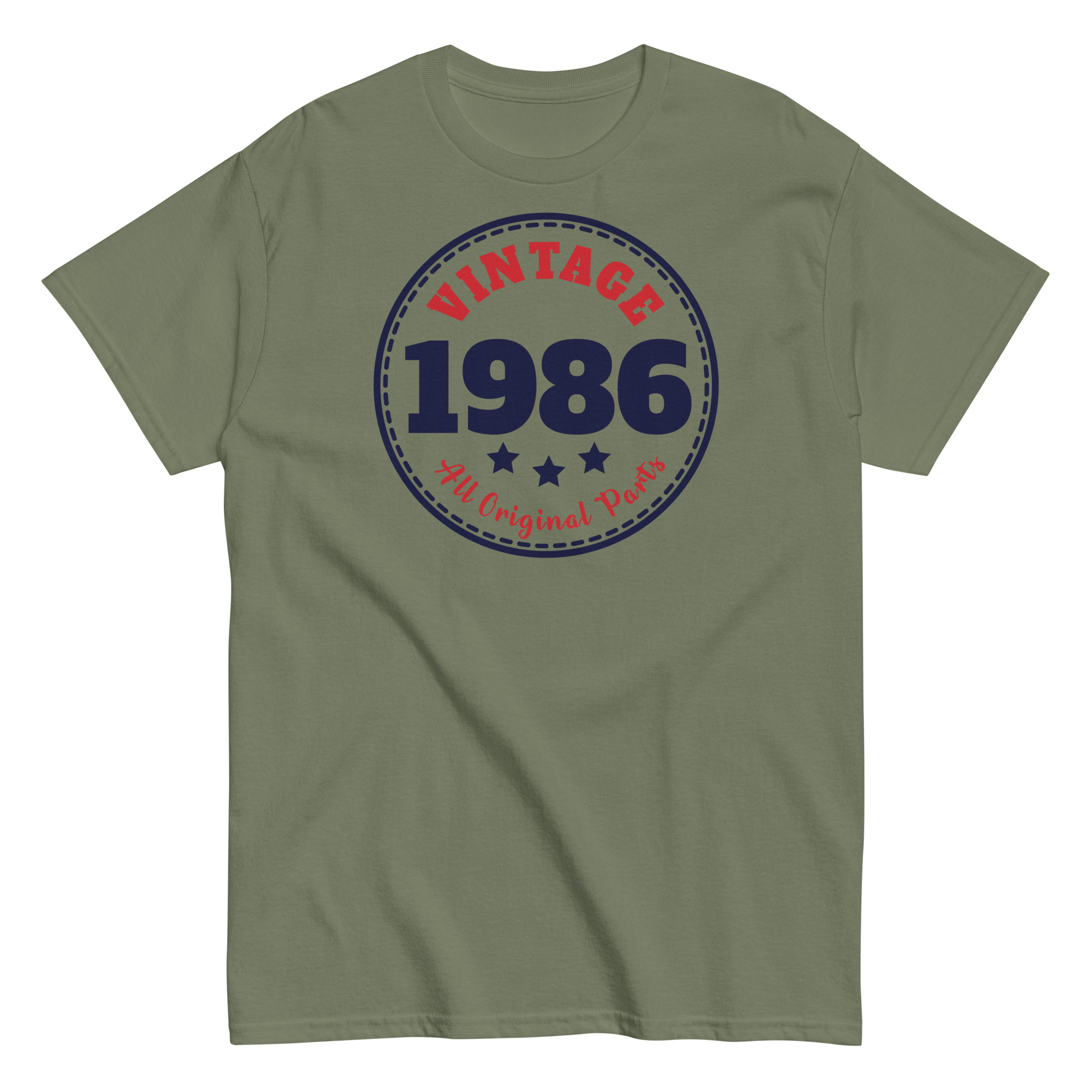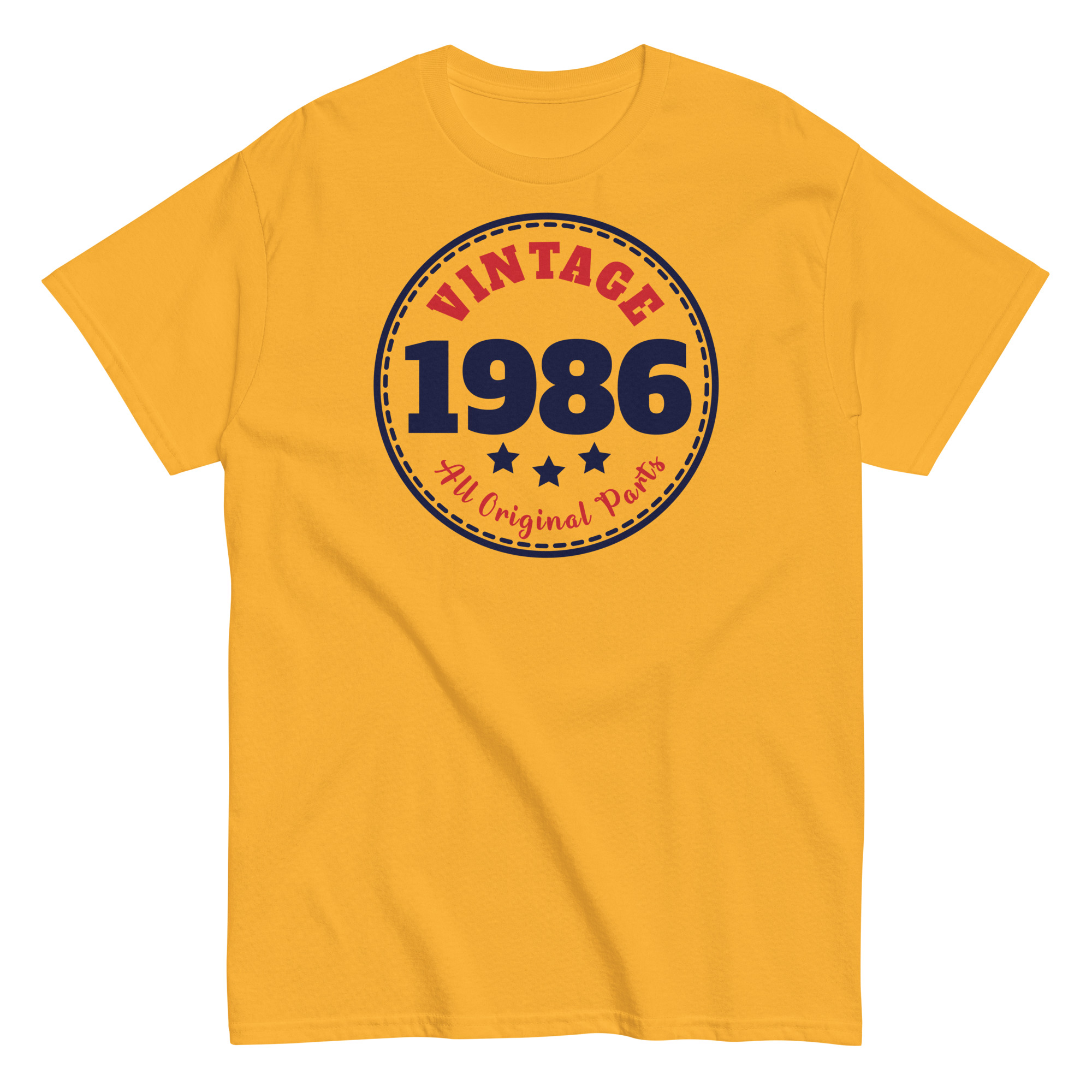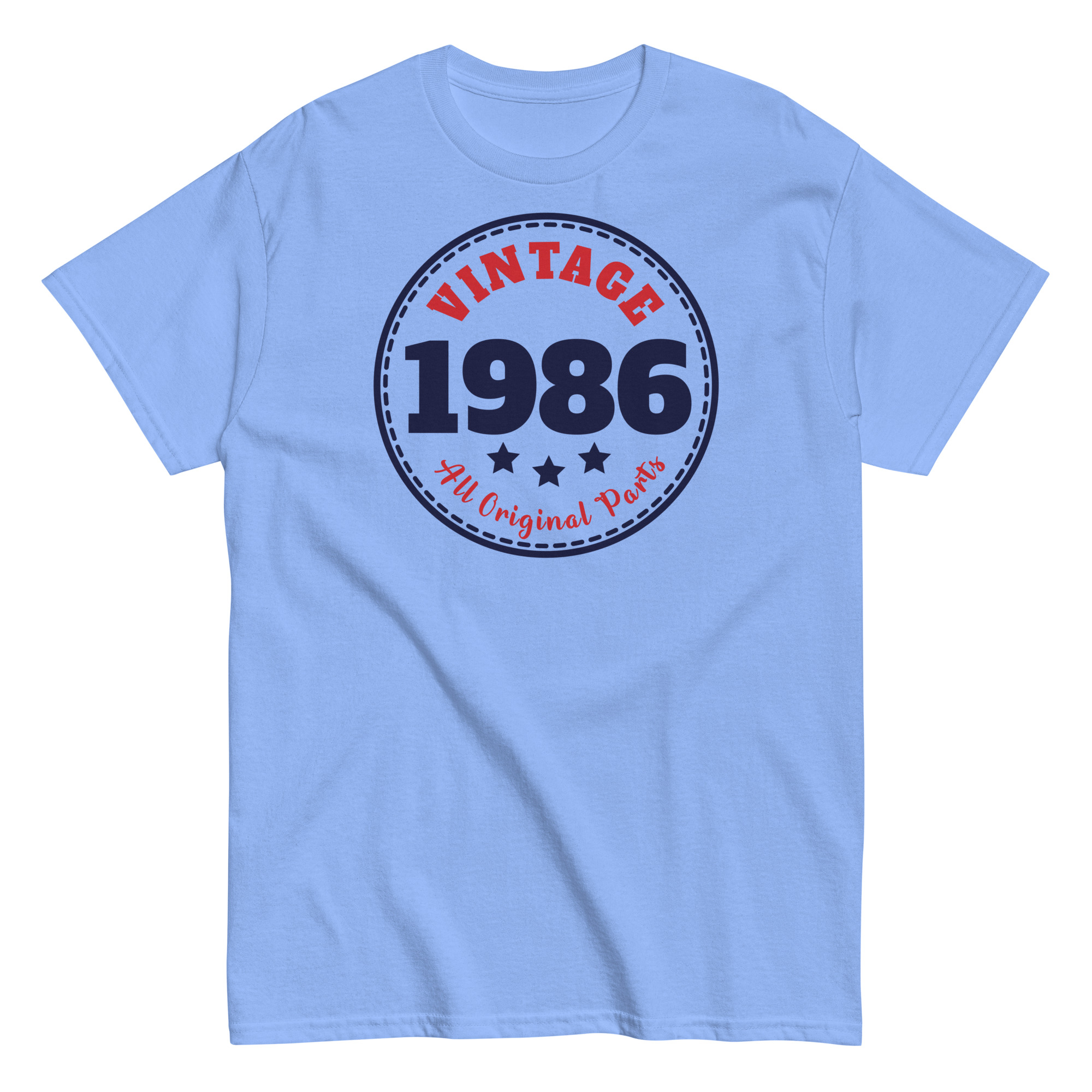 Designed in a circular emblem style, these vintage Birthday T-shirts showcases “Vintage 1986” in bold, navy blue and red print – surrounded by stars and stitched-style borders. It’s a subtle throwback to classic badge logos, giving the tee a crisp, old-school charm that feels anything but outdated. The words “All Original Parts” underline the message with a playful wink, making this the kind of shirt that gets compliments – and chuckles – wherever he wears it.