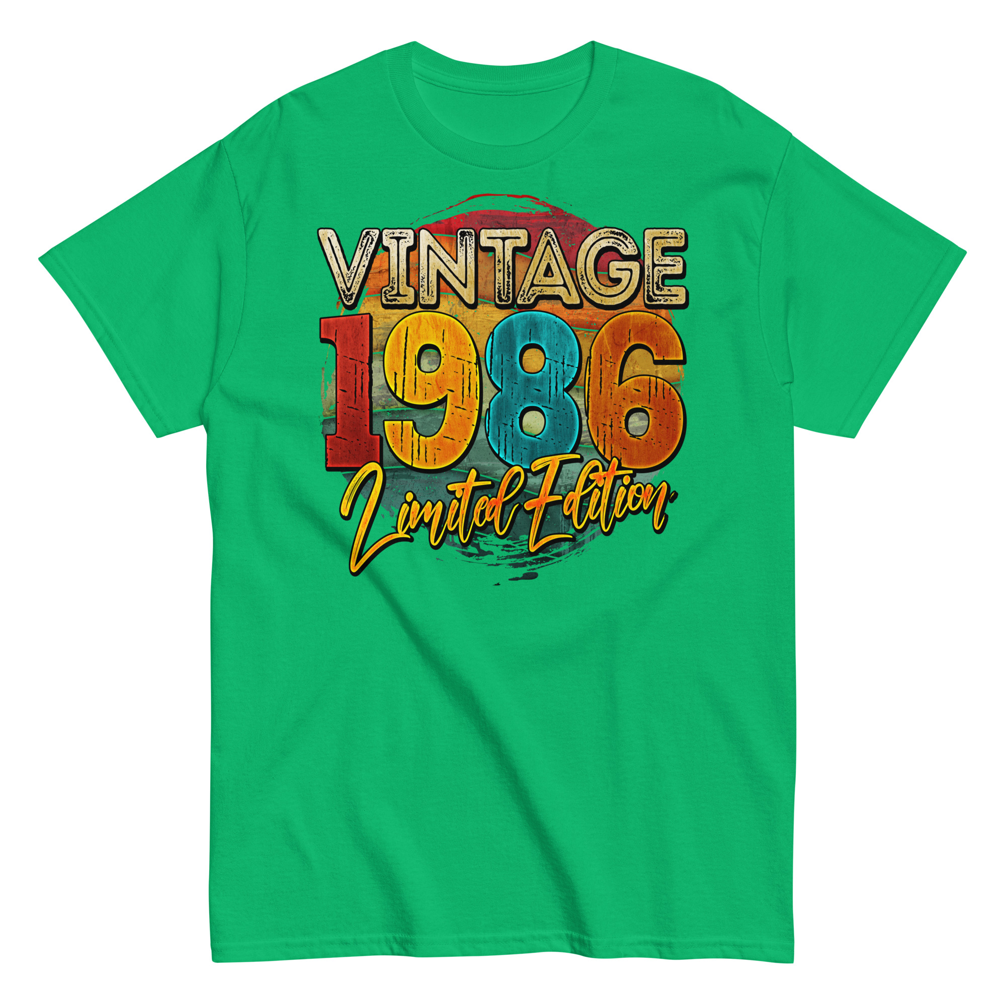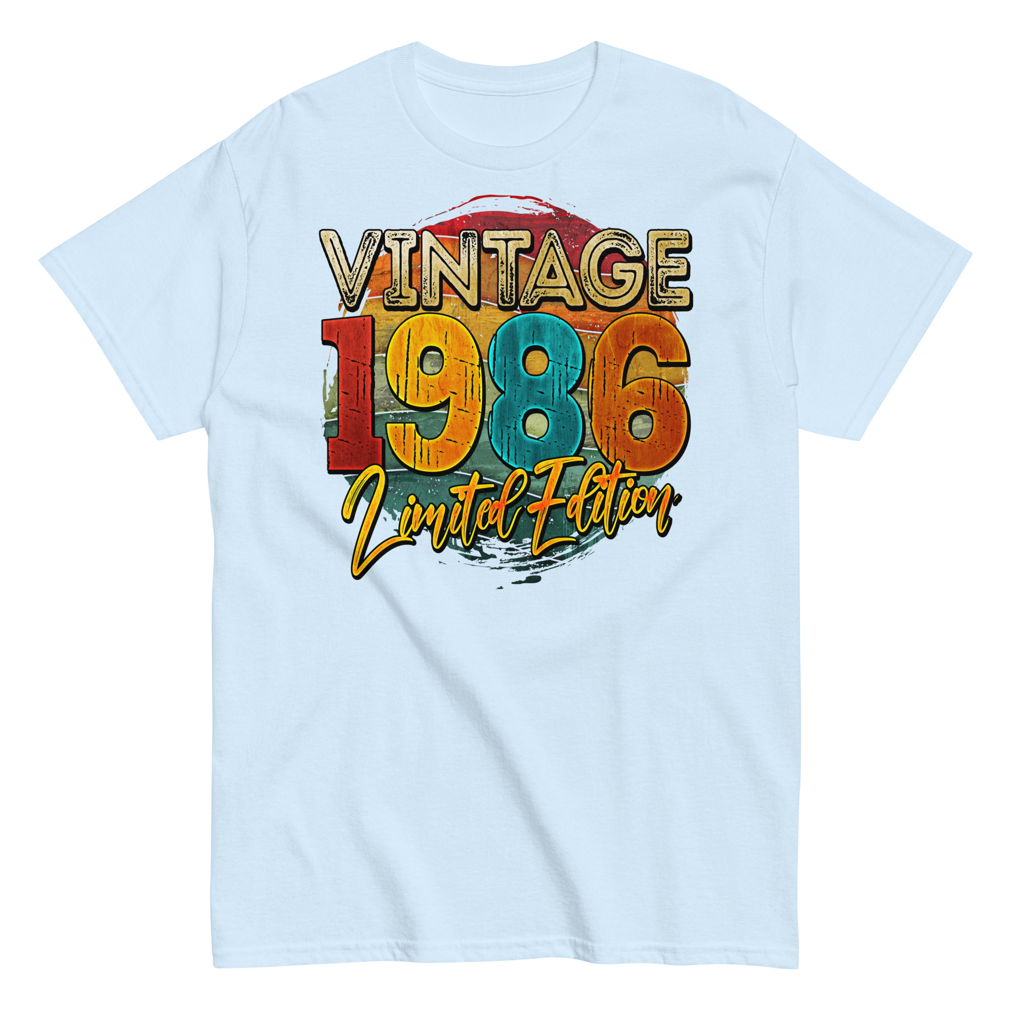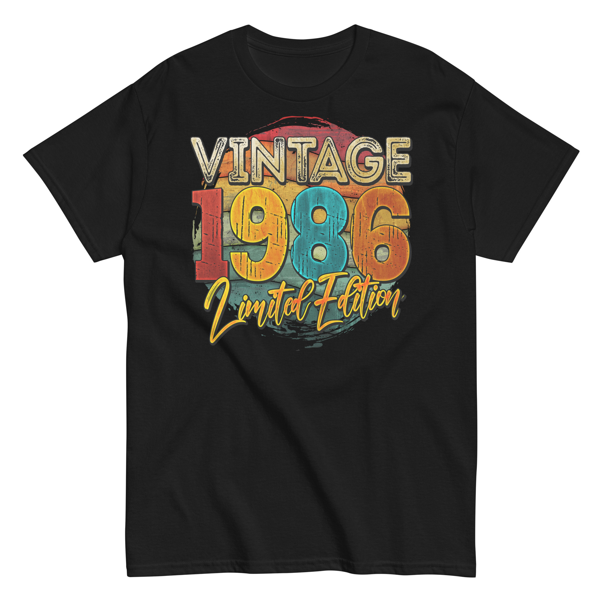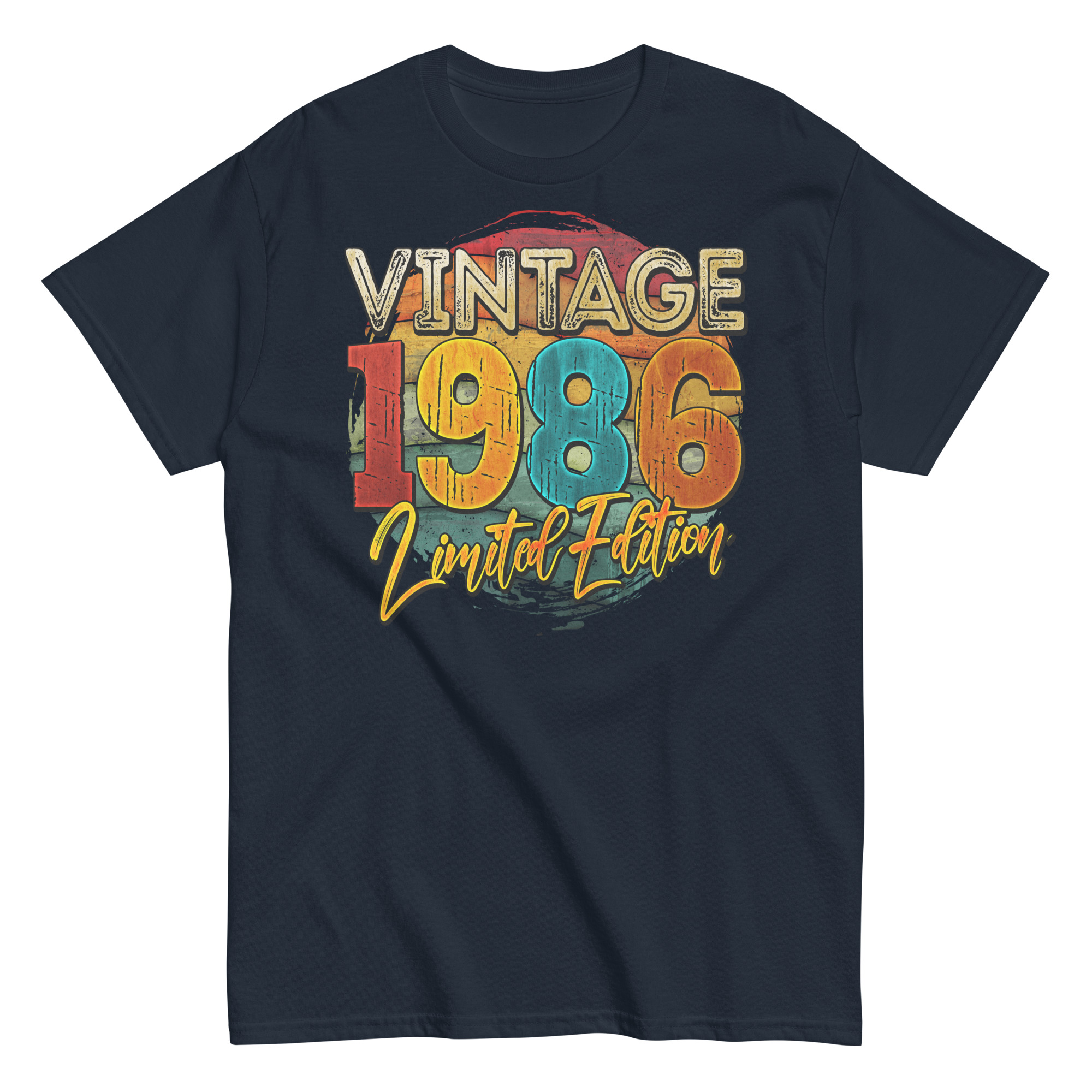 This design does all the talking. With its distressed lettering and rainbow-stained wood texture, the graphic screams “authentic classic.” The numbers “1986” take centre stage in a bold, blocky font, drenched in vintage tones of red, yellow, and turquoise – giving off that sun-faded, lived-in look that every retro-loving bloke can appreciate. Below, the words “Limited Edition” are written in stylish script, cementing the fact that he’s not just any man – he’s one of a select few worth celebrating.