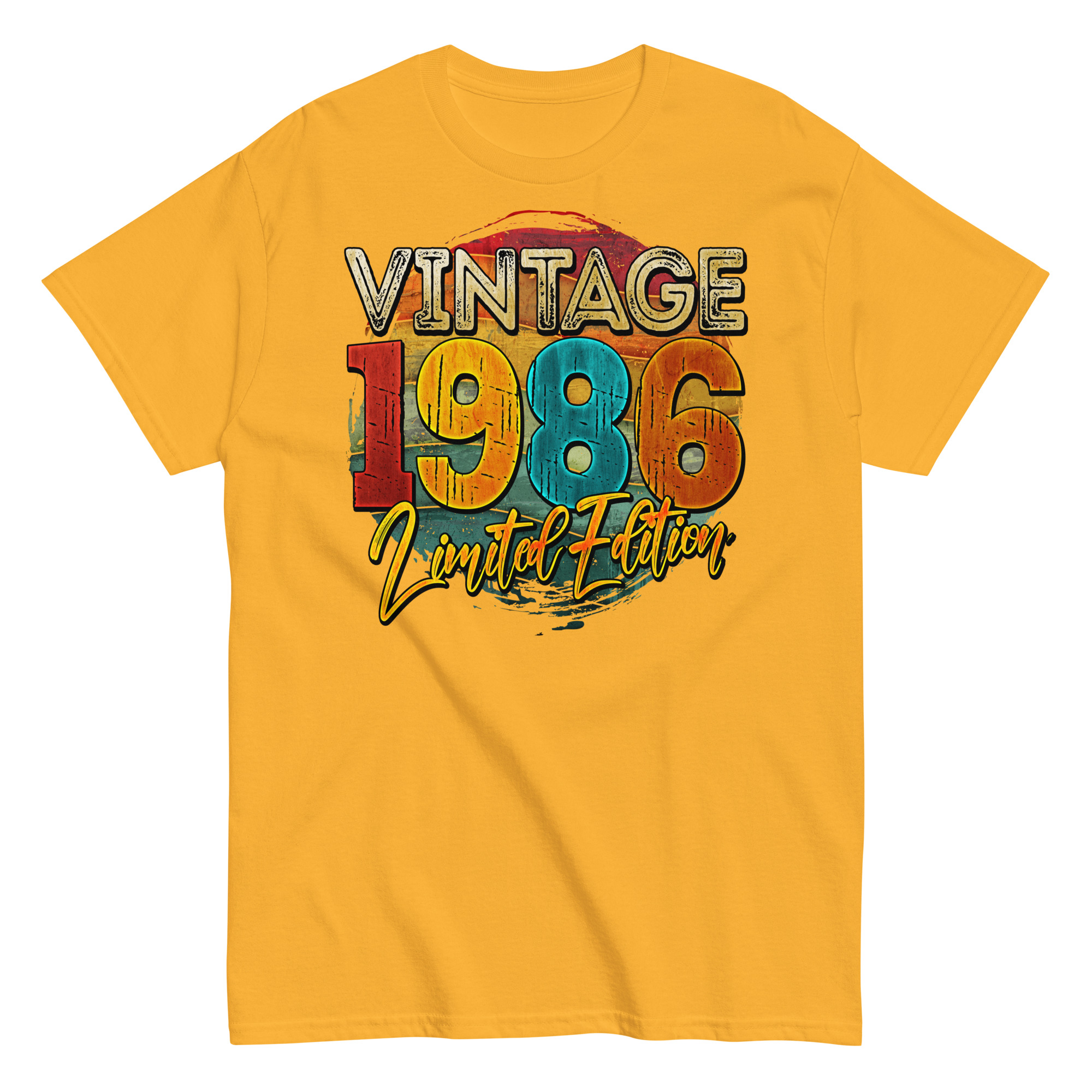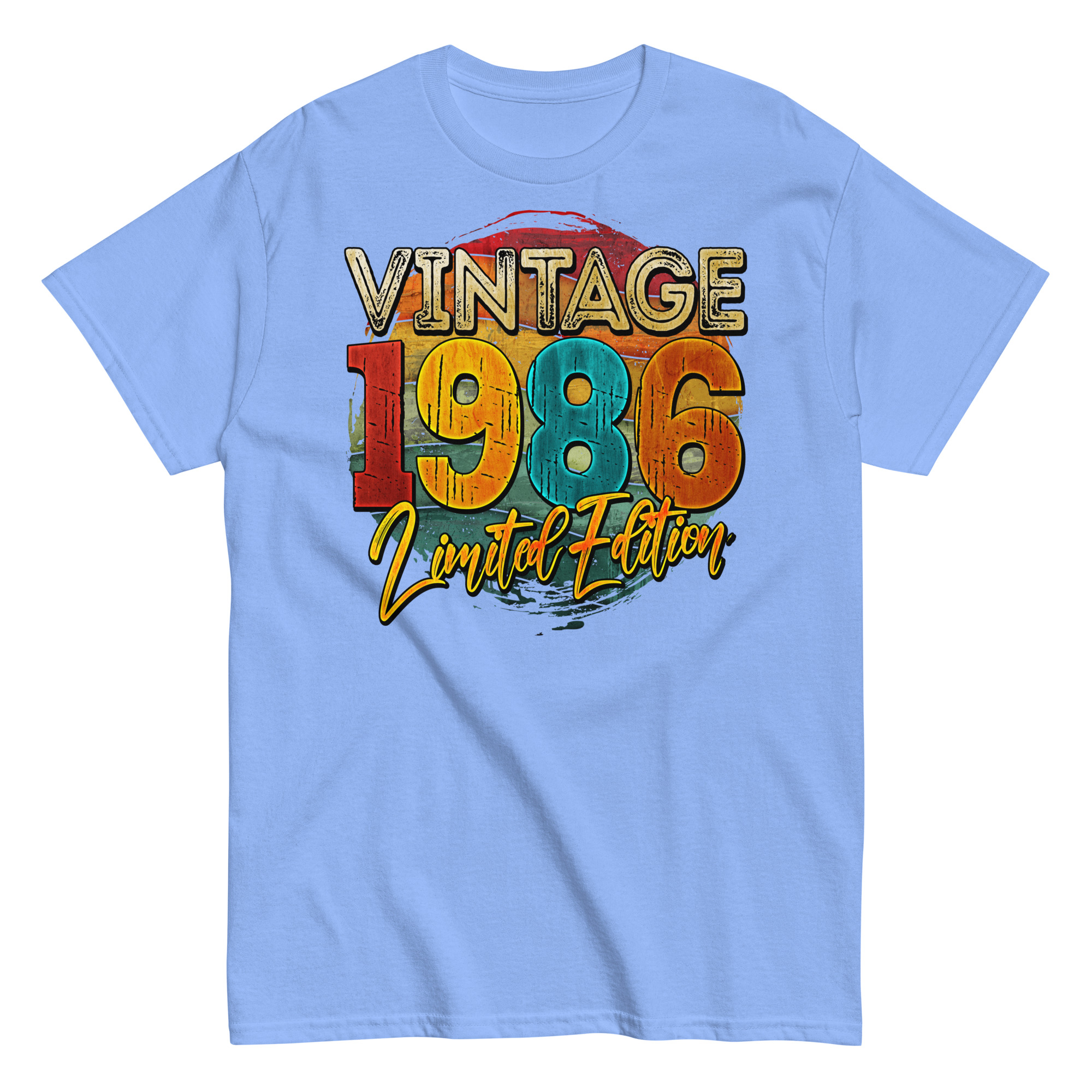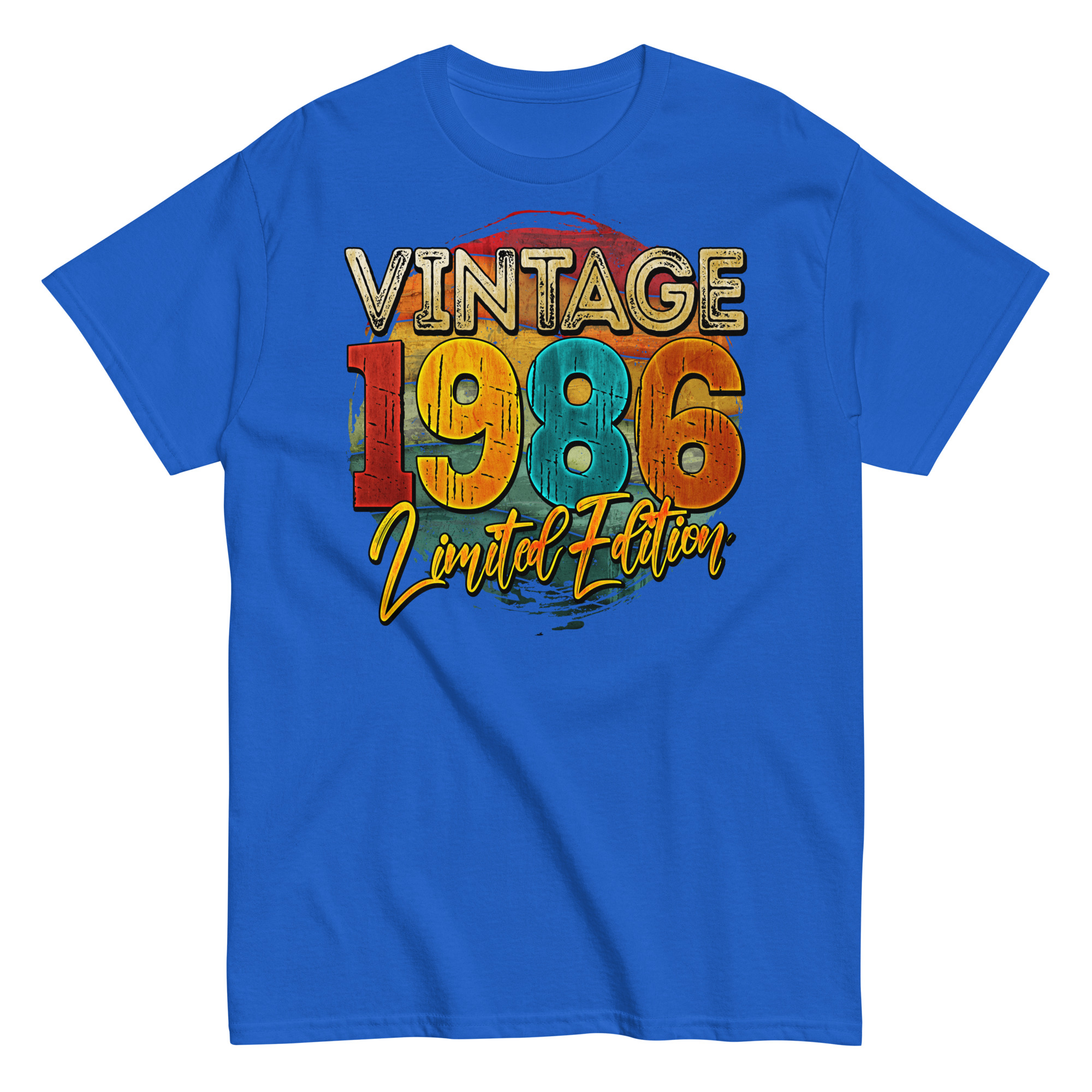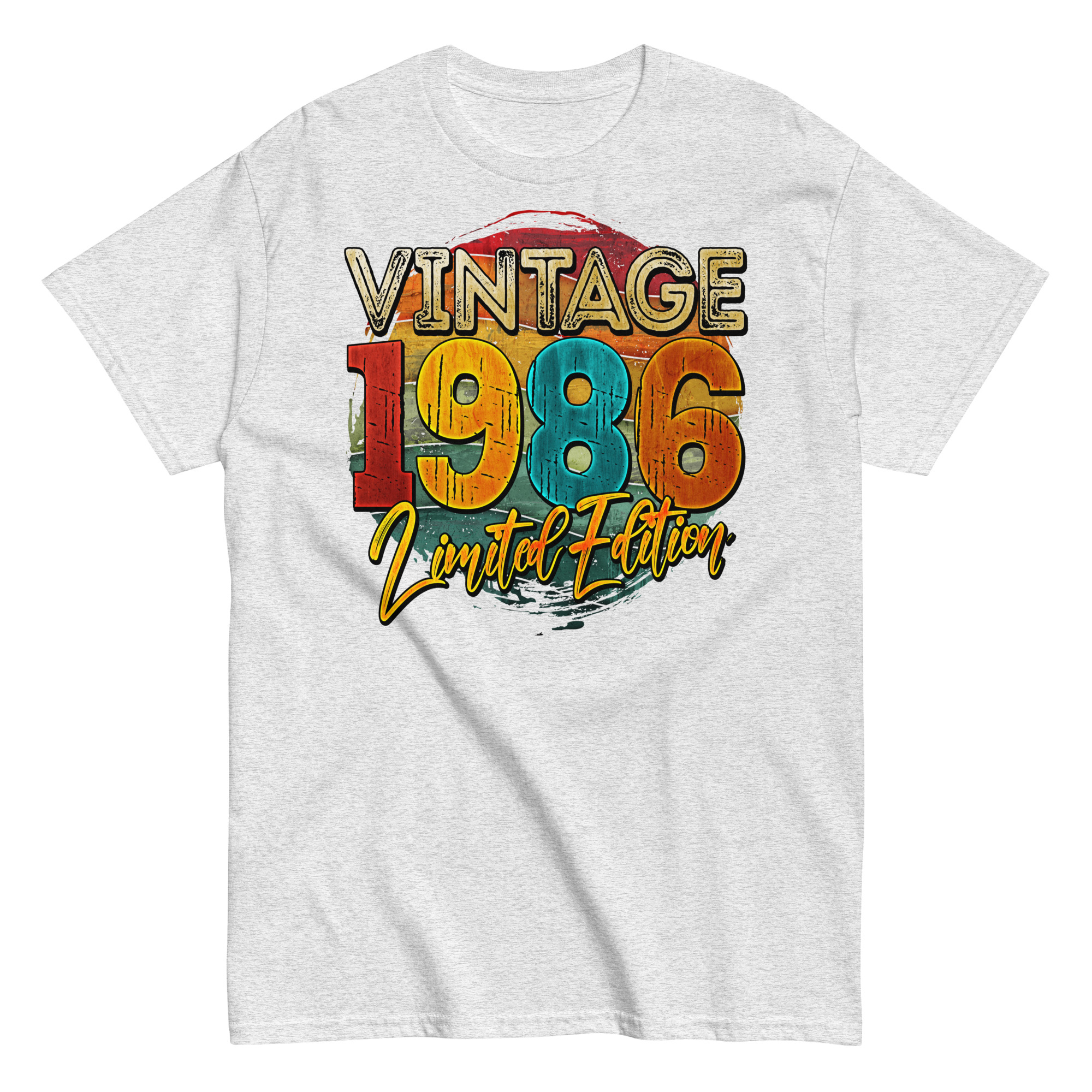 This design does all the talking. With its distressed lettering and rainbow-stained wood texture, the graphic screams “authentic classic.” The numbers “1986” take centre stage in a bold, blocky font, drenched in vintage tones of red, yellow, and turquoise – giving off that sun-faded, lived-in look that every retro-loving bloke can appreciate. Below, the words “Limited Edition” are written in stylish script, cementing the fact that he’s not just any man – he’s one of a select few worth celebrating.