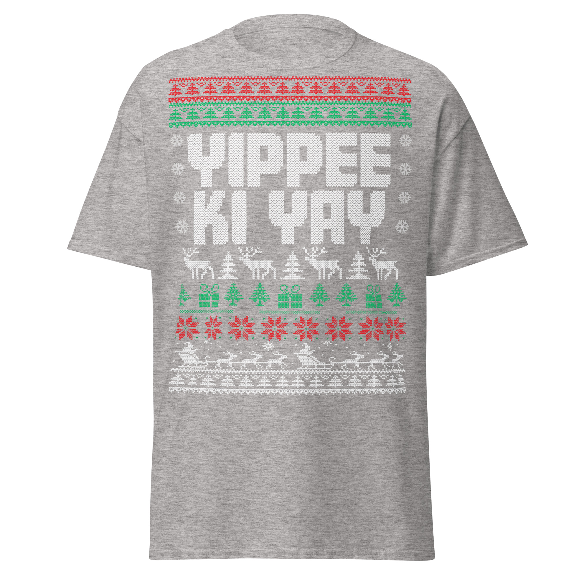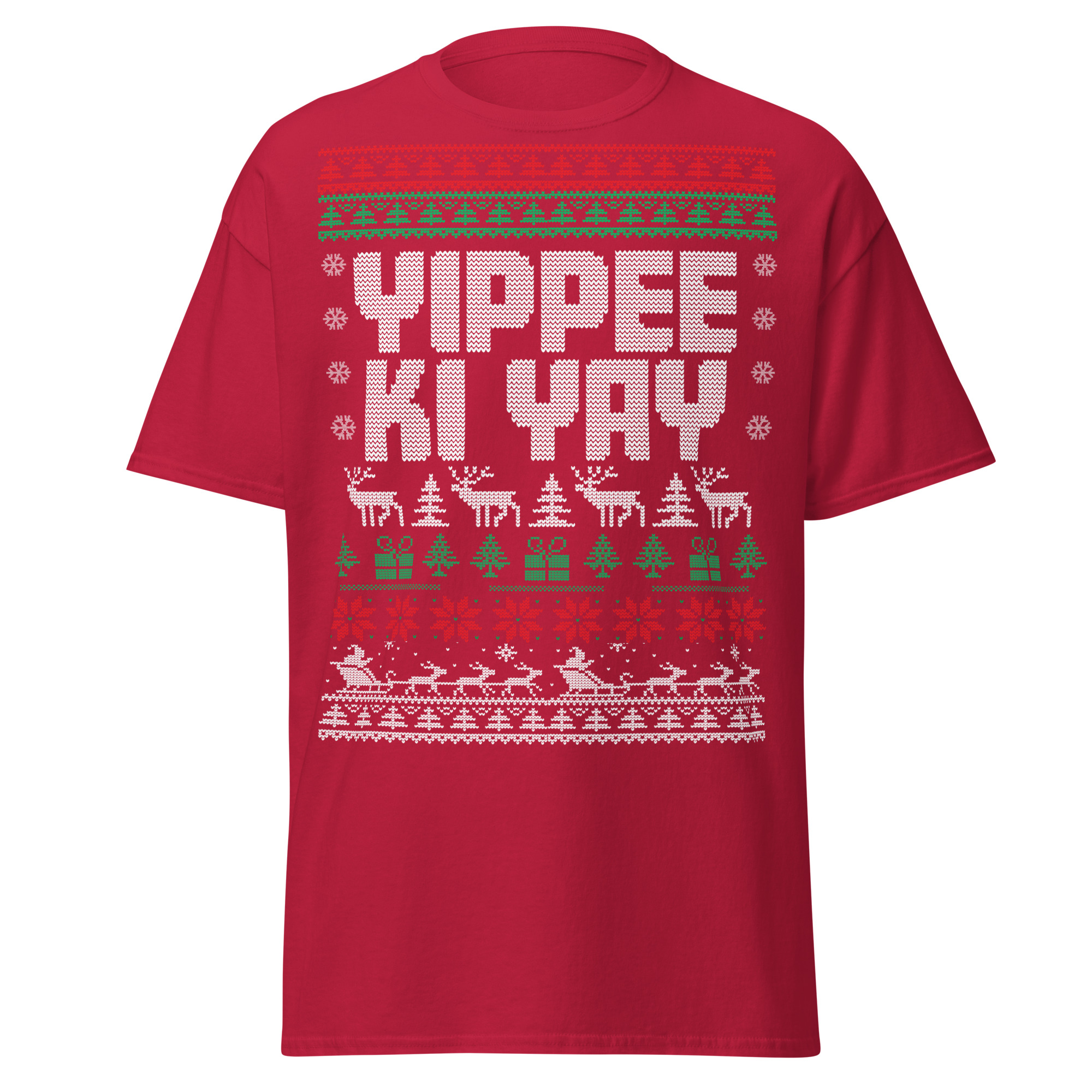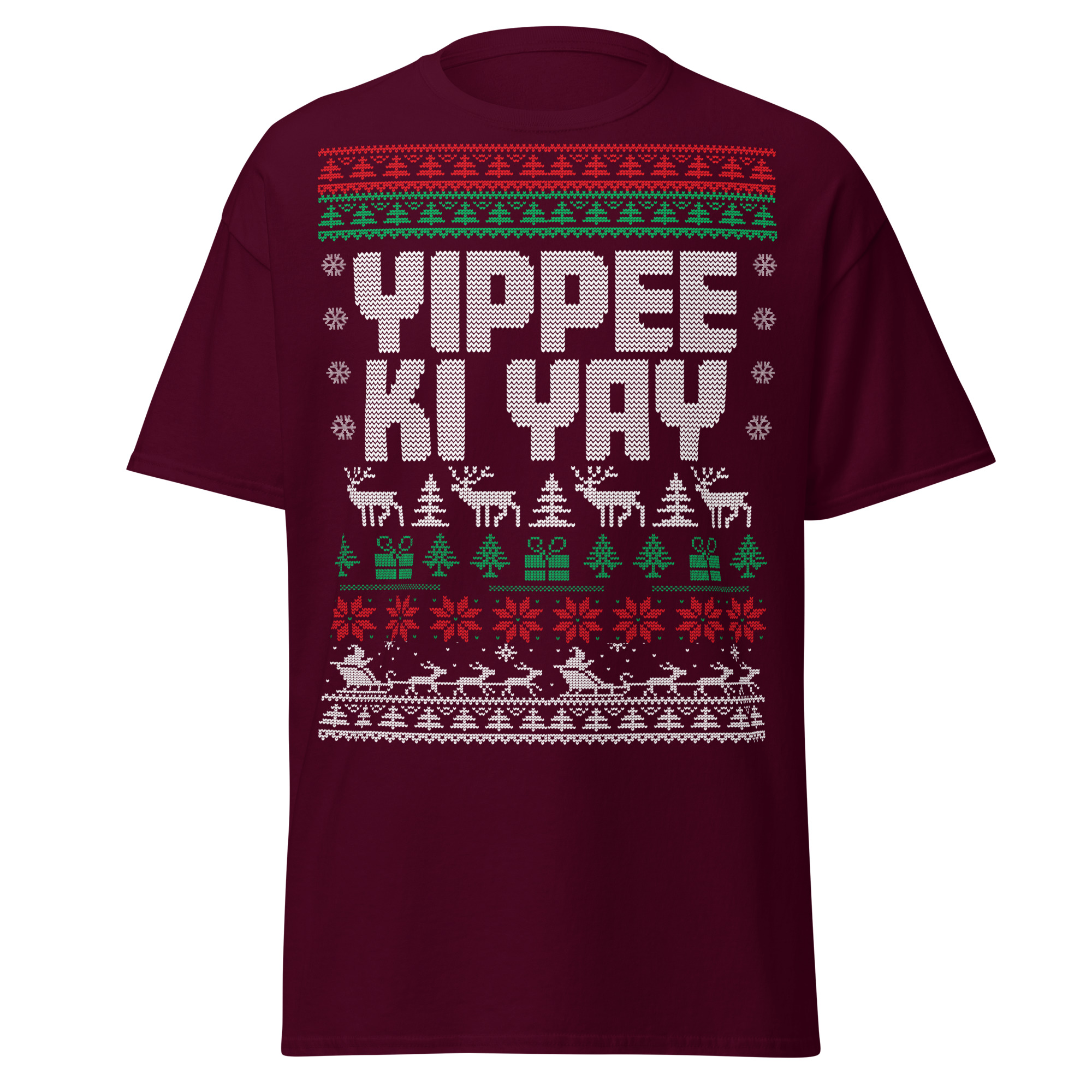The design uses a knitted jumper style pattern that looks cosy at first glance, then reveals a bold Yippee Ki Yay message front and centre. The layout includes reindeer, trees, presents and snowflakes to give it a proper Christmas feel. It captures the spirit of the film without needing to show anything too obvious, which keeps it wearable for the office, the pub, family gatherings or a Christmas jumper day that allows T-shirts too. The whole thing gives a cheeky nod to action fans who enjoy bringing their favourite film into the season with a smile.